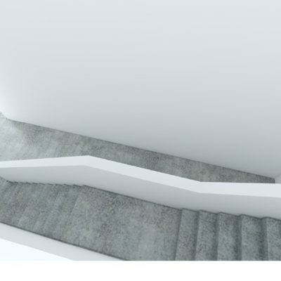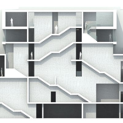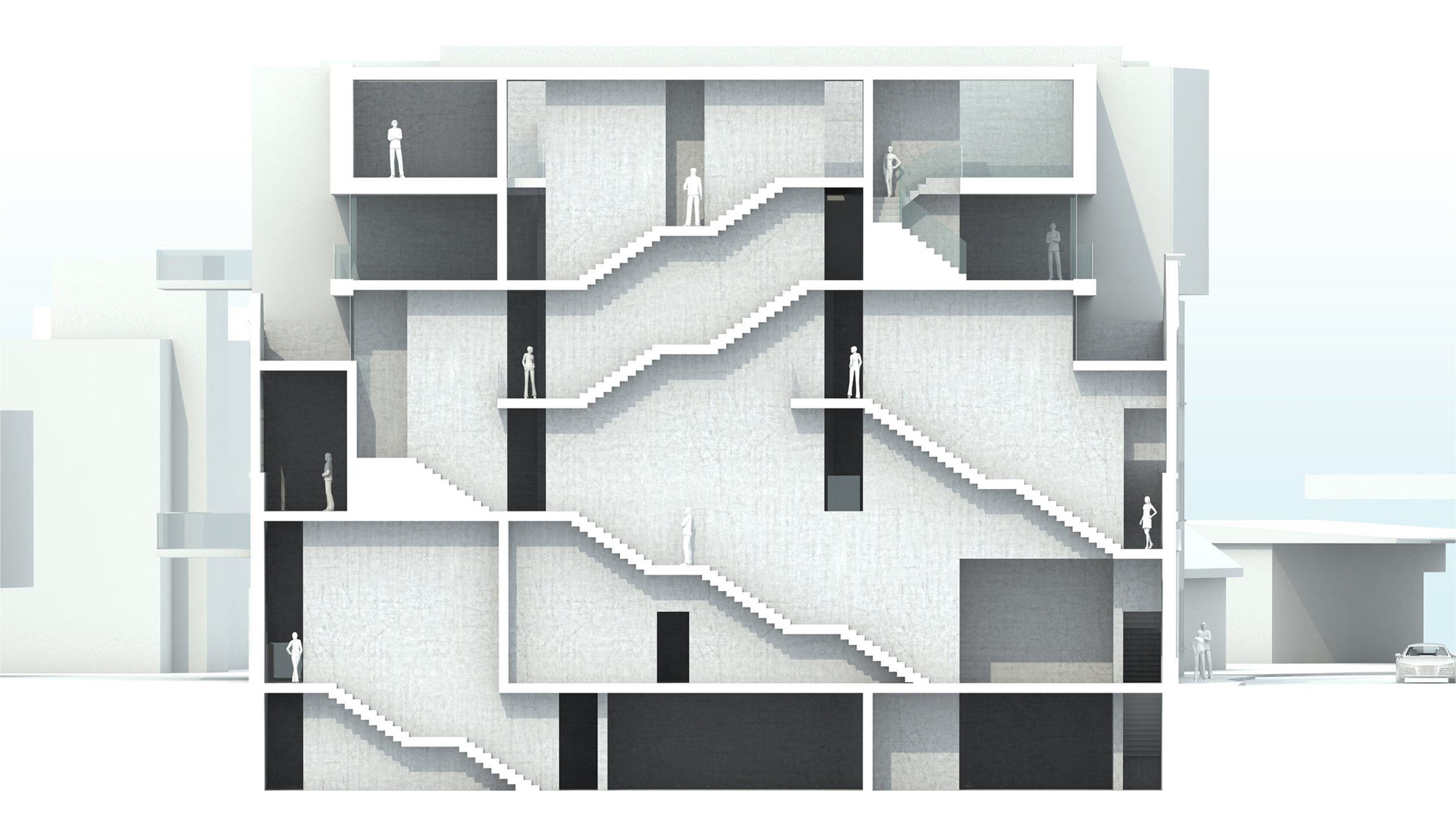 A vertical maze of interweaving staircases seen from below resolves into rational escape routes when approached from the upper floors. There is one window in the monolithic facade to the north giving clean views through to the city beyond.