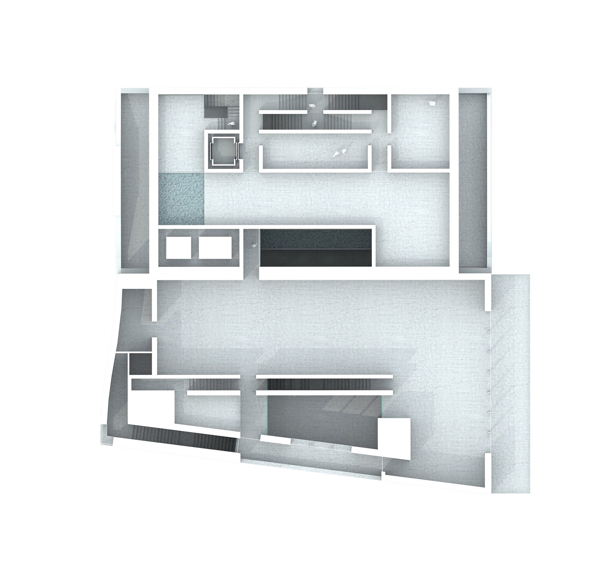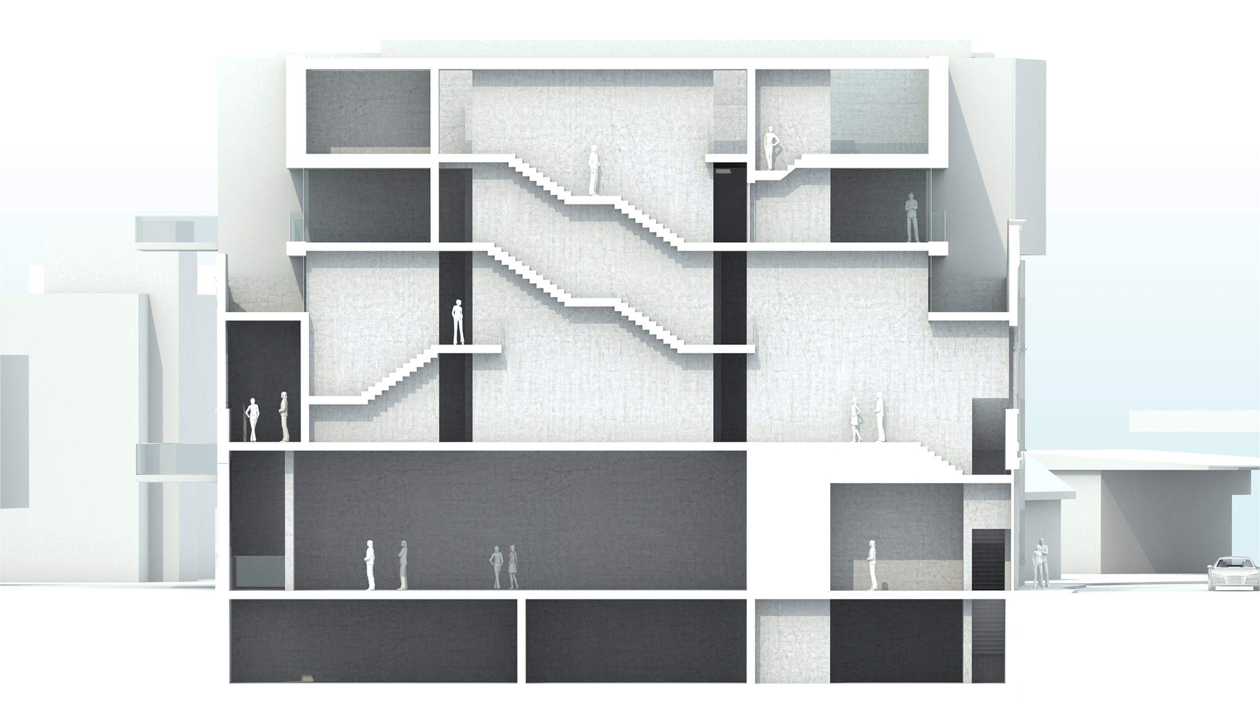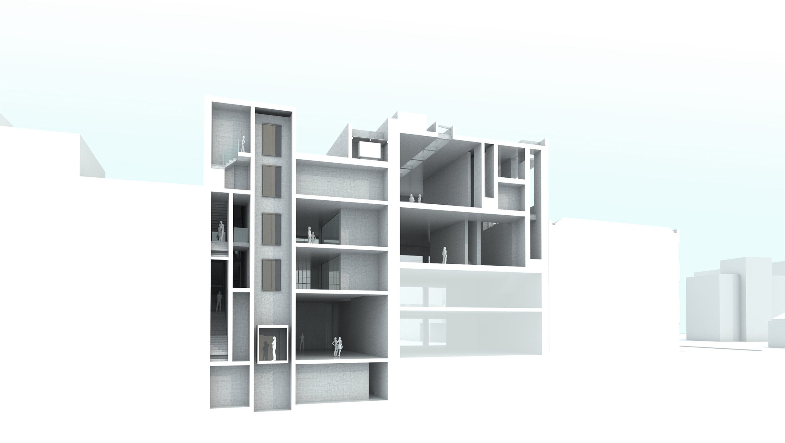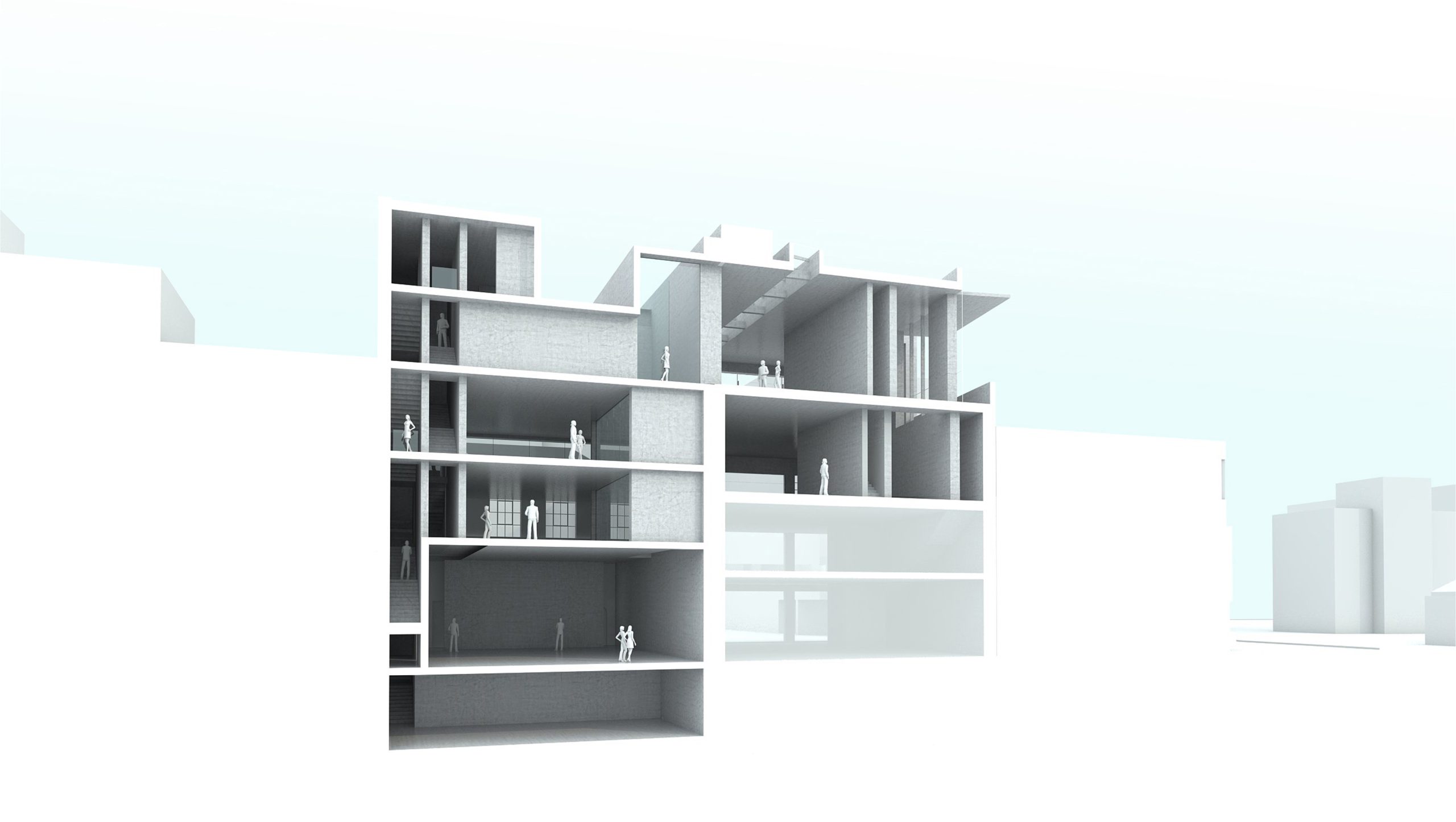 Sparse orthogonal plans are played off against complexity in section to create a series of unique spaces. Every space within the building will have a very specific identity because of the variation in section.