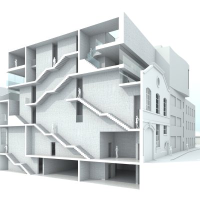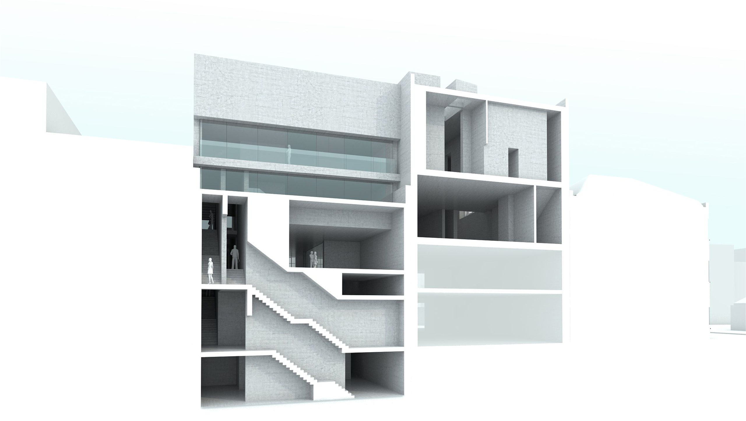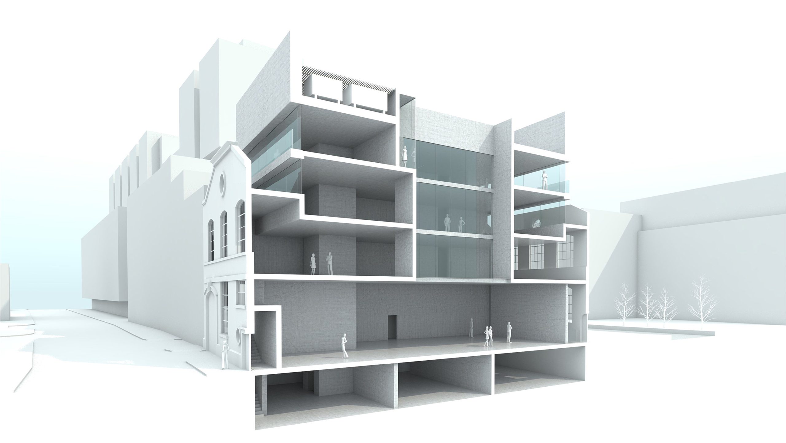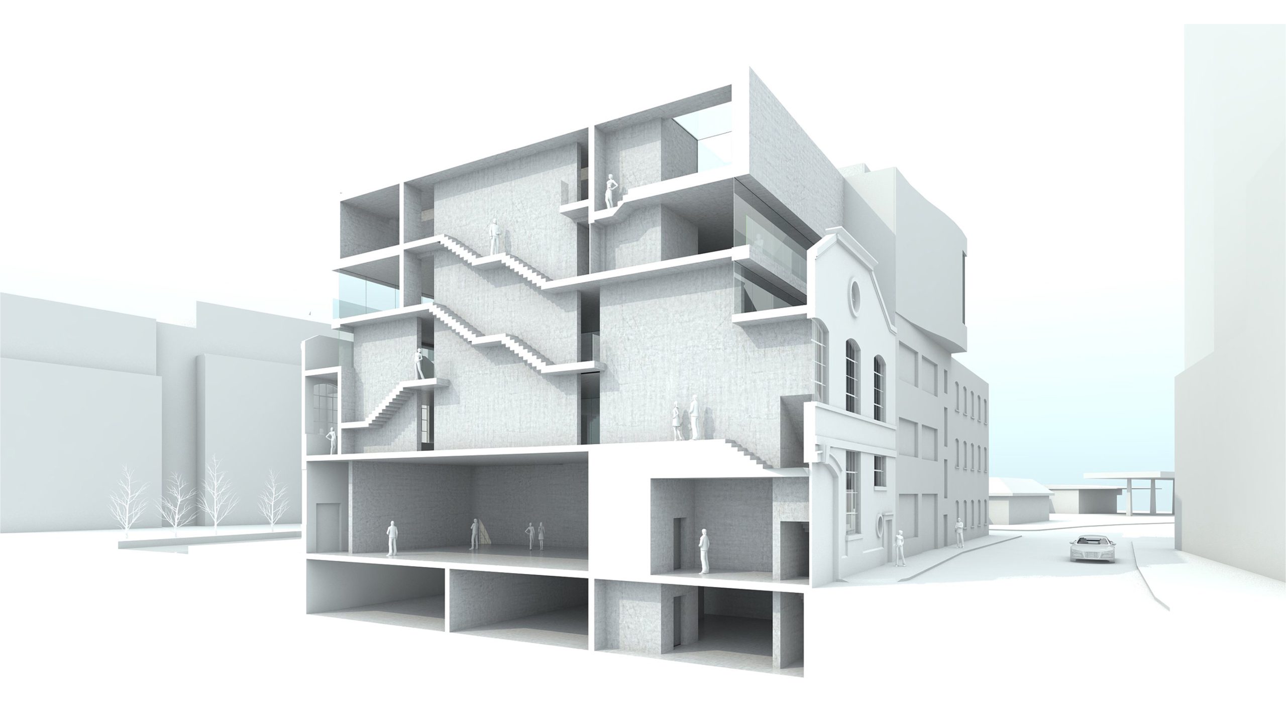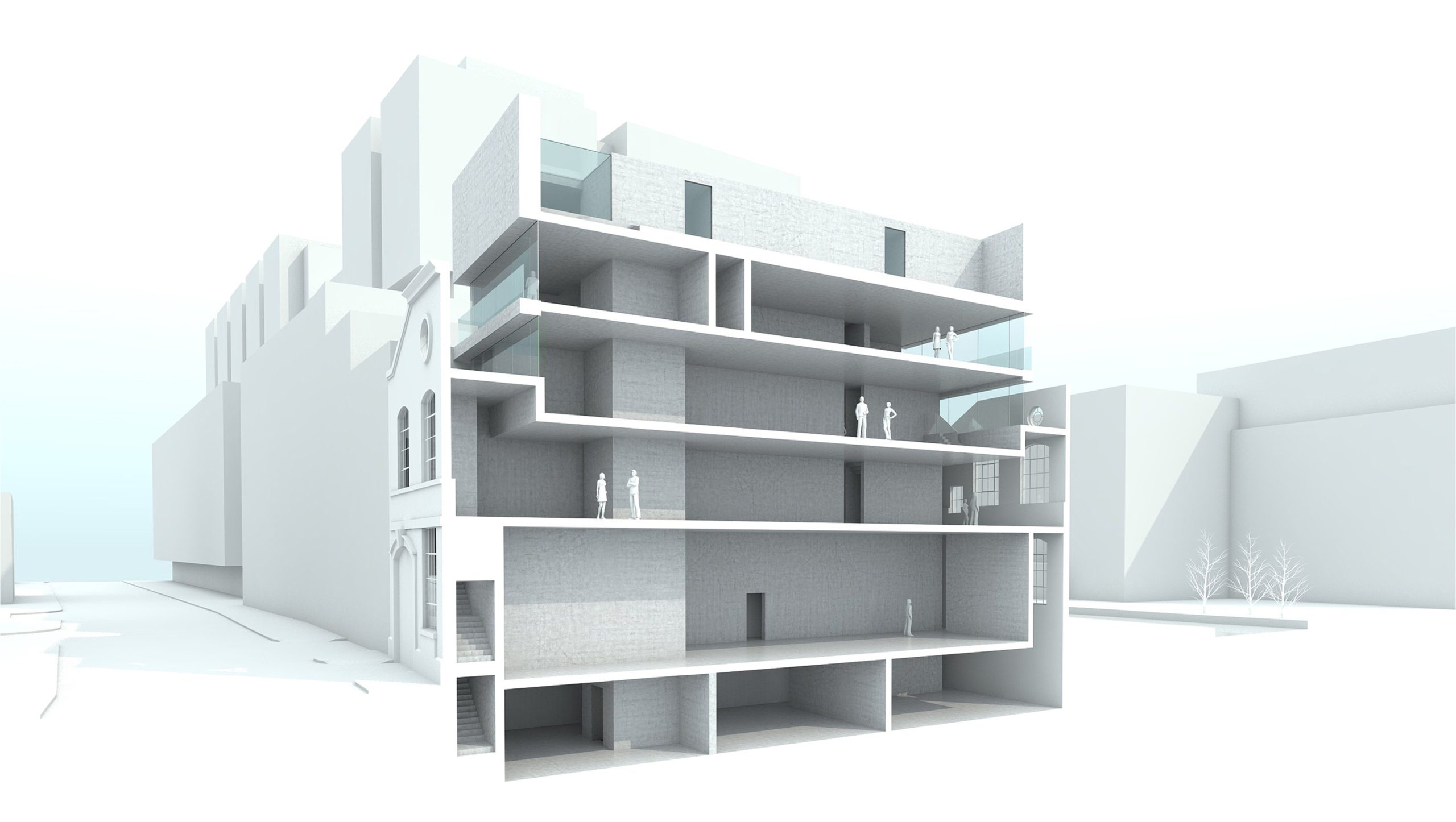Sparse orthogonal plans are played off against complexity in section to create a series of unique spaces. Every space within the building will have a very specific identity because of the variation in section.