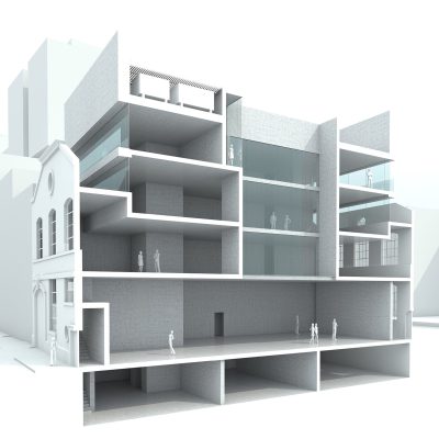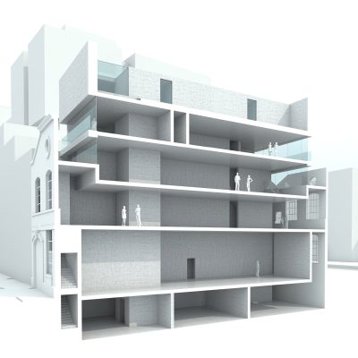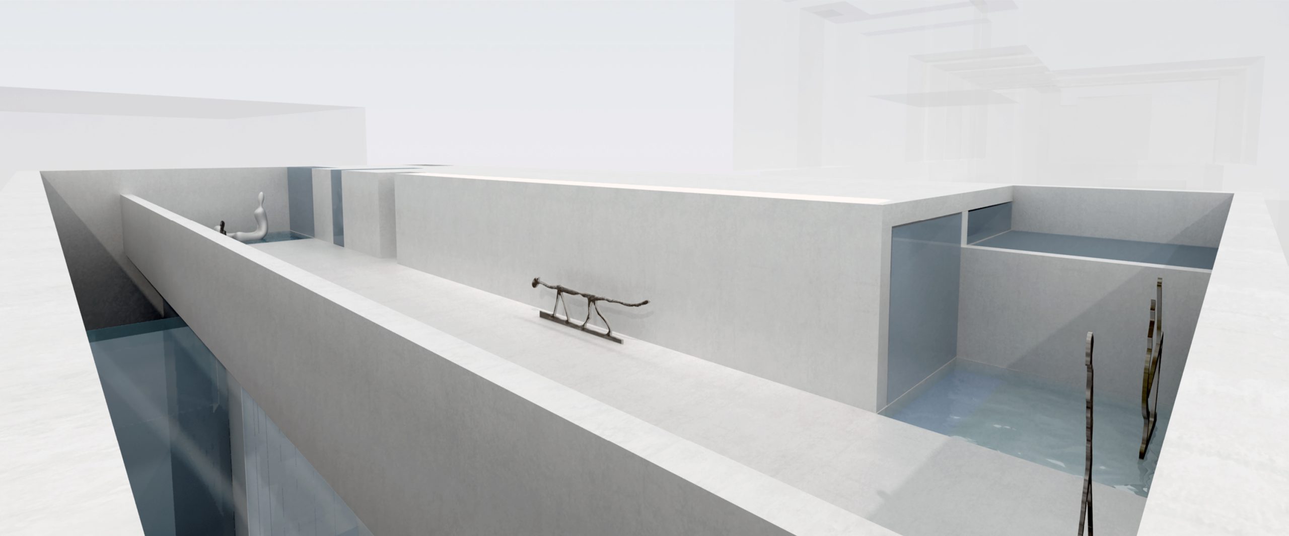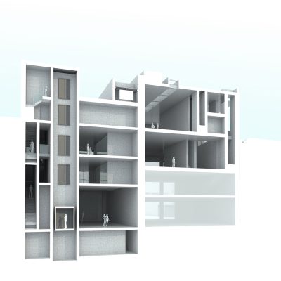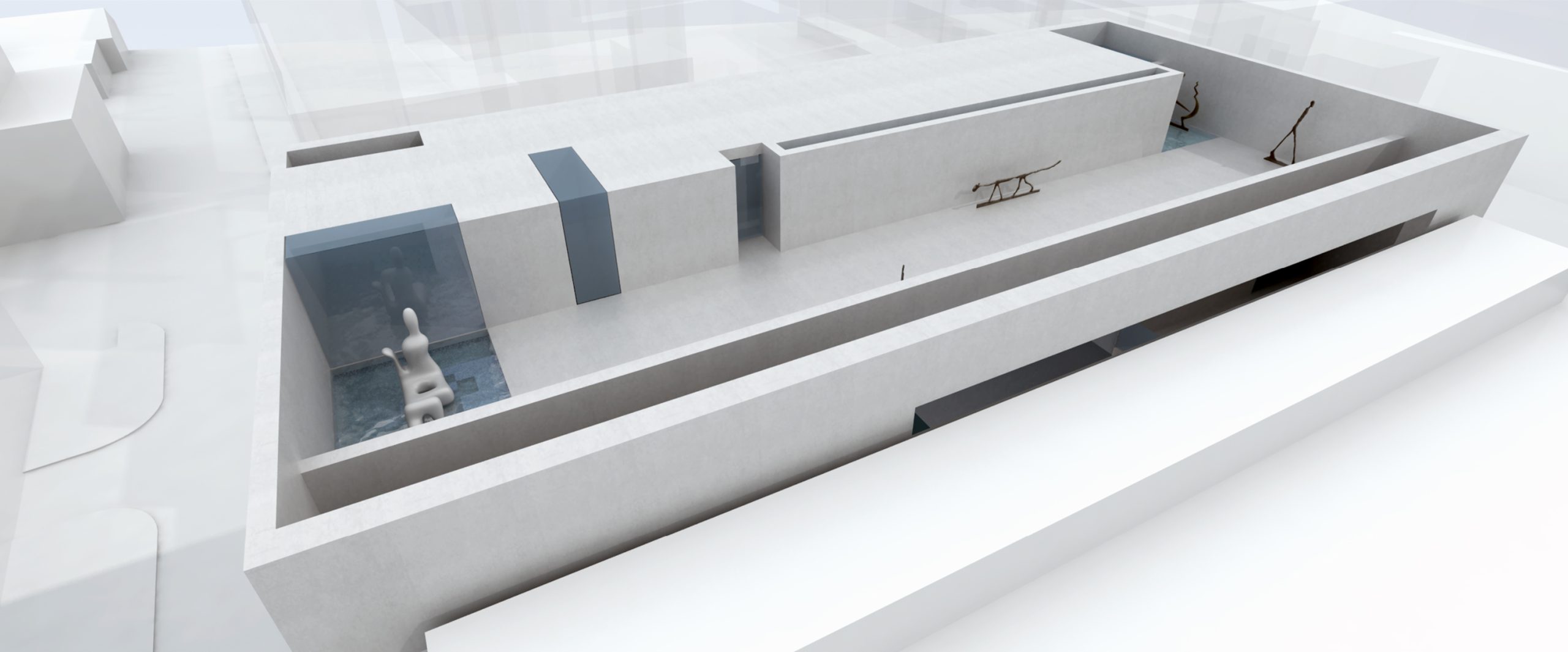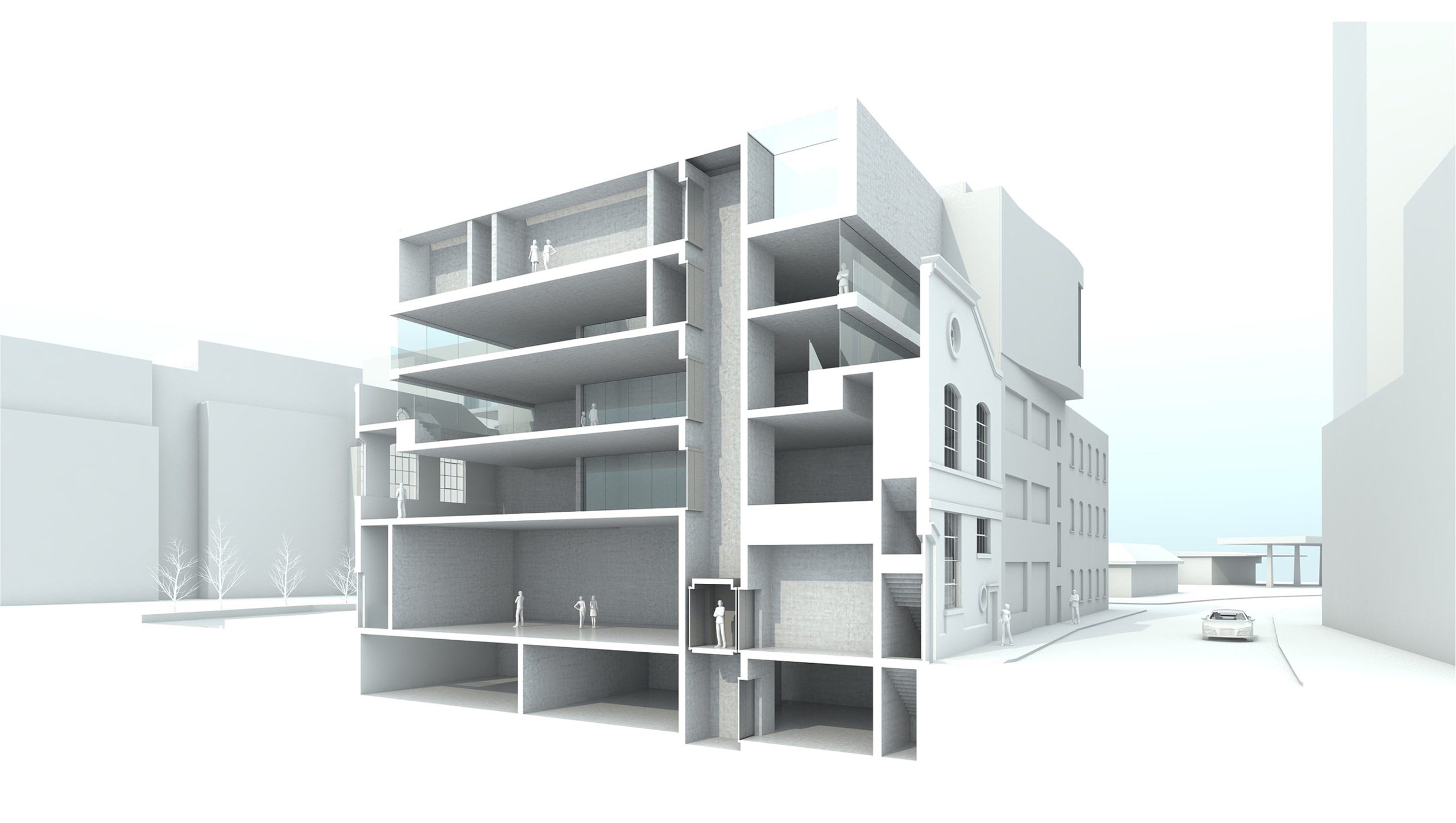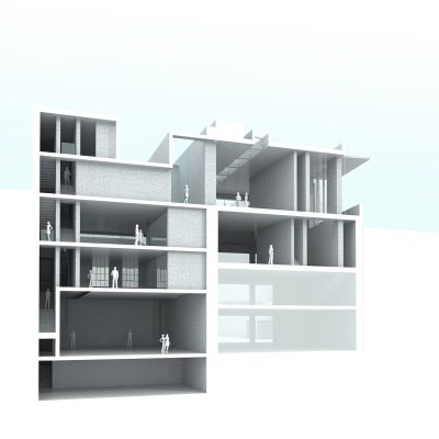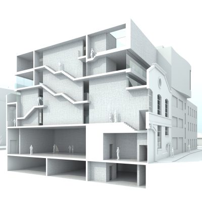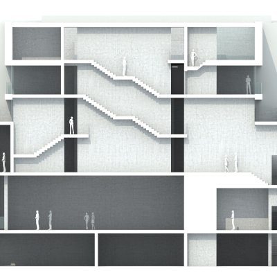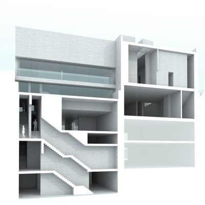 Sparse orthogonal plans are played off against complexity in section to create a series of unique spaces. Every space within the building will have a very specific identity because of the variation in section.