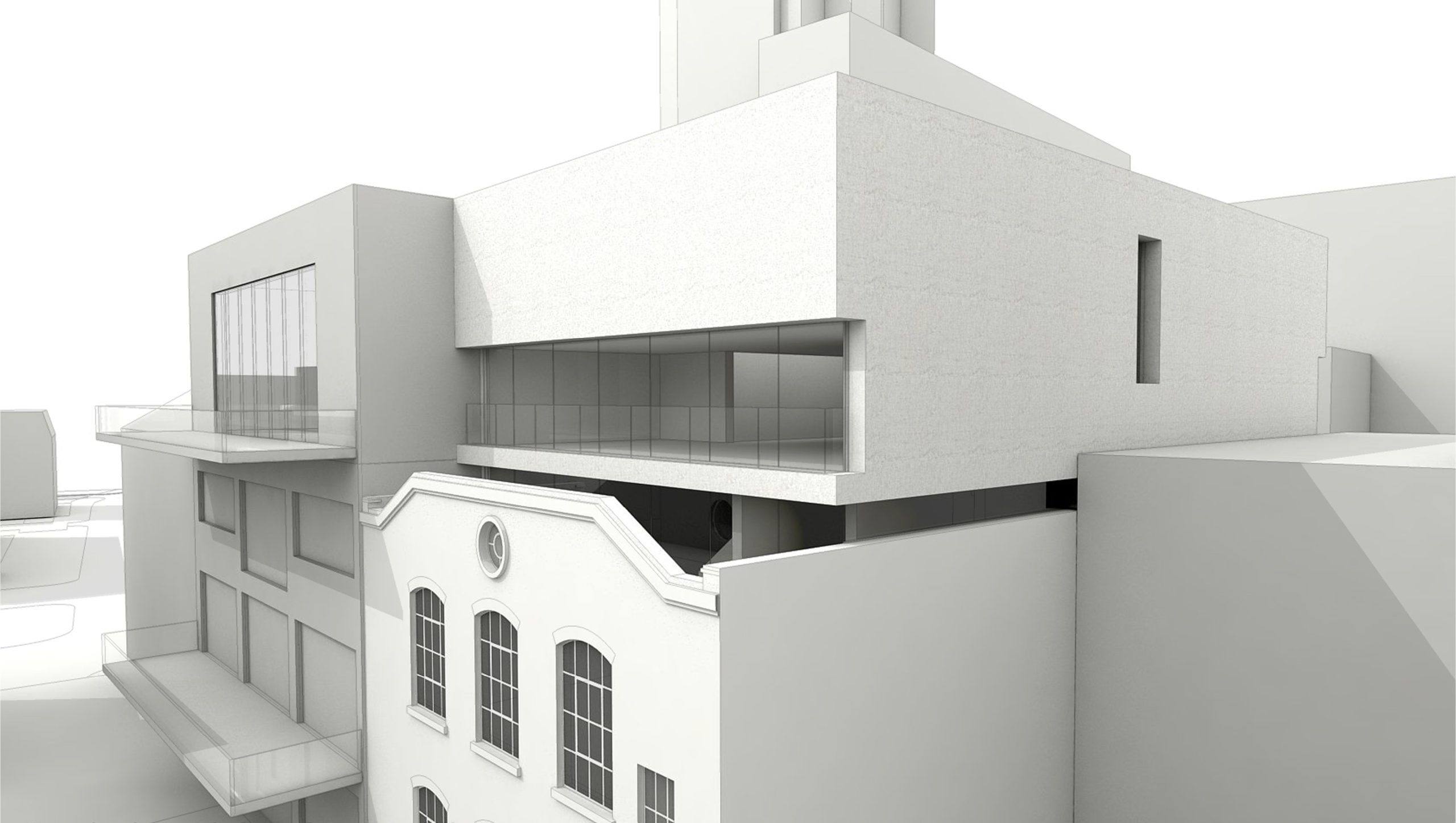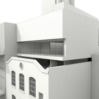 The existing facade has been left undisturbed, but a new presence floats over the top. There is no visible linkage to either front or rear facade between the old and the new proposal. The facade of the new block has been recessed behind that of both the facades below and also the adjoining building.