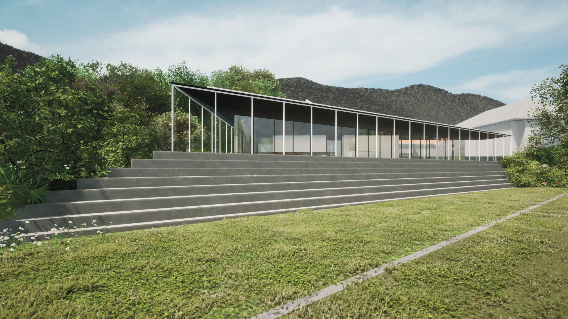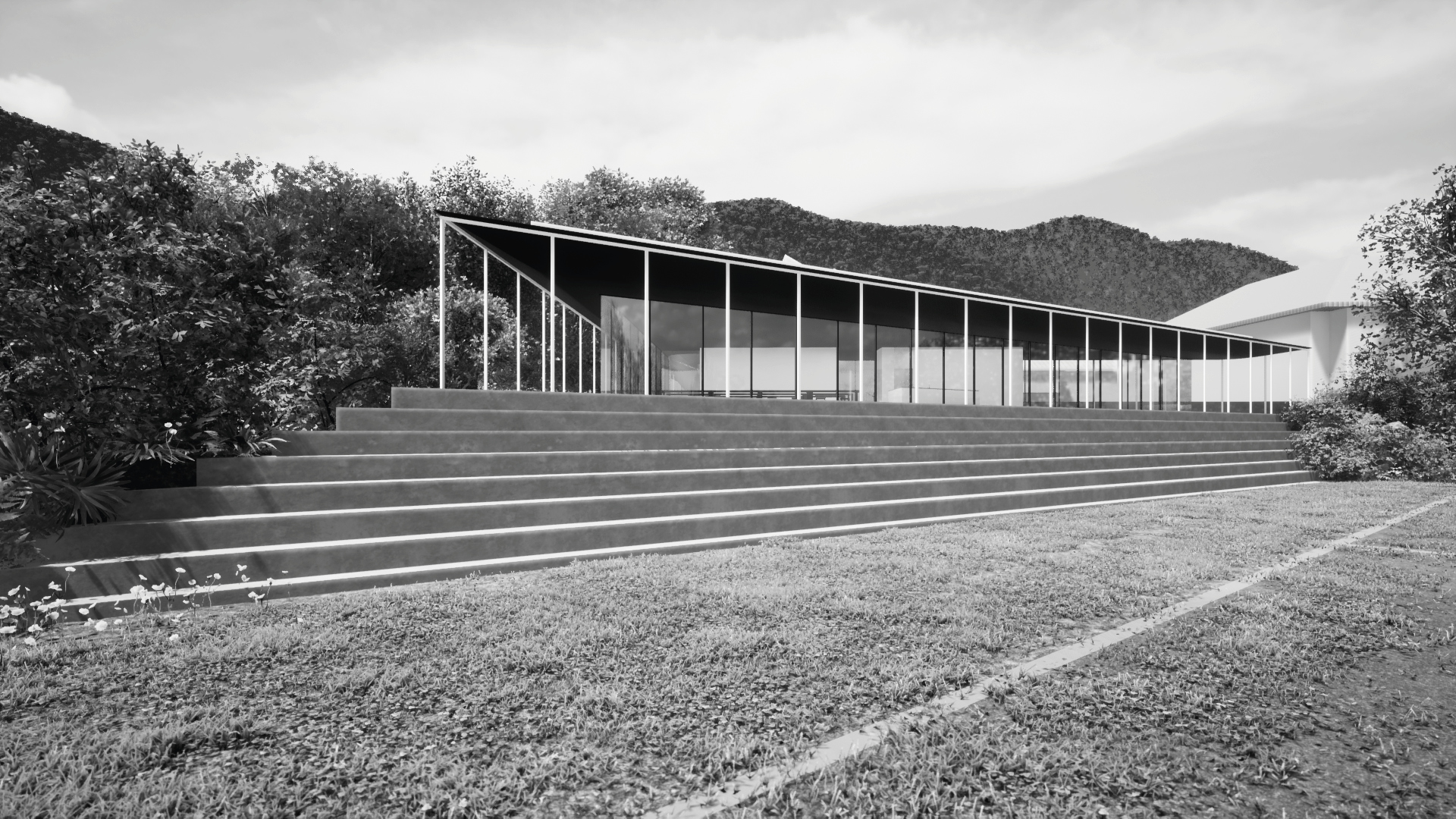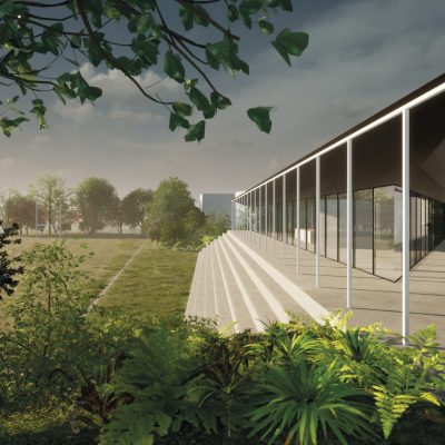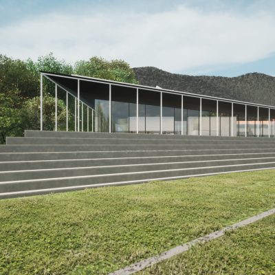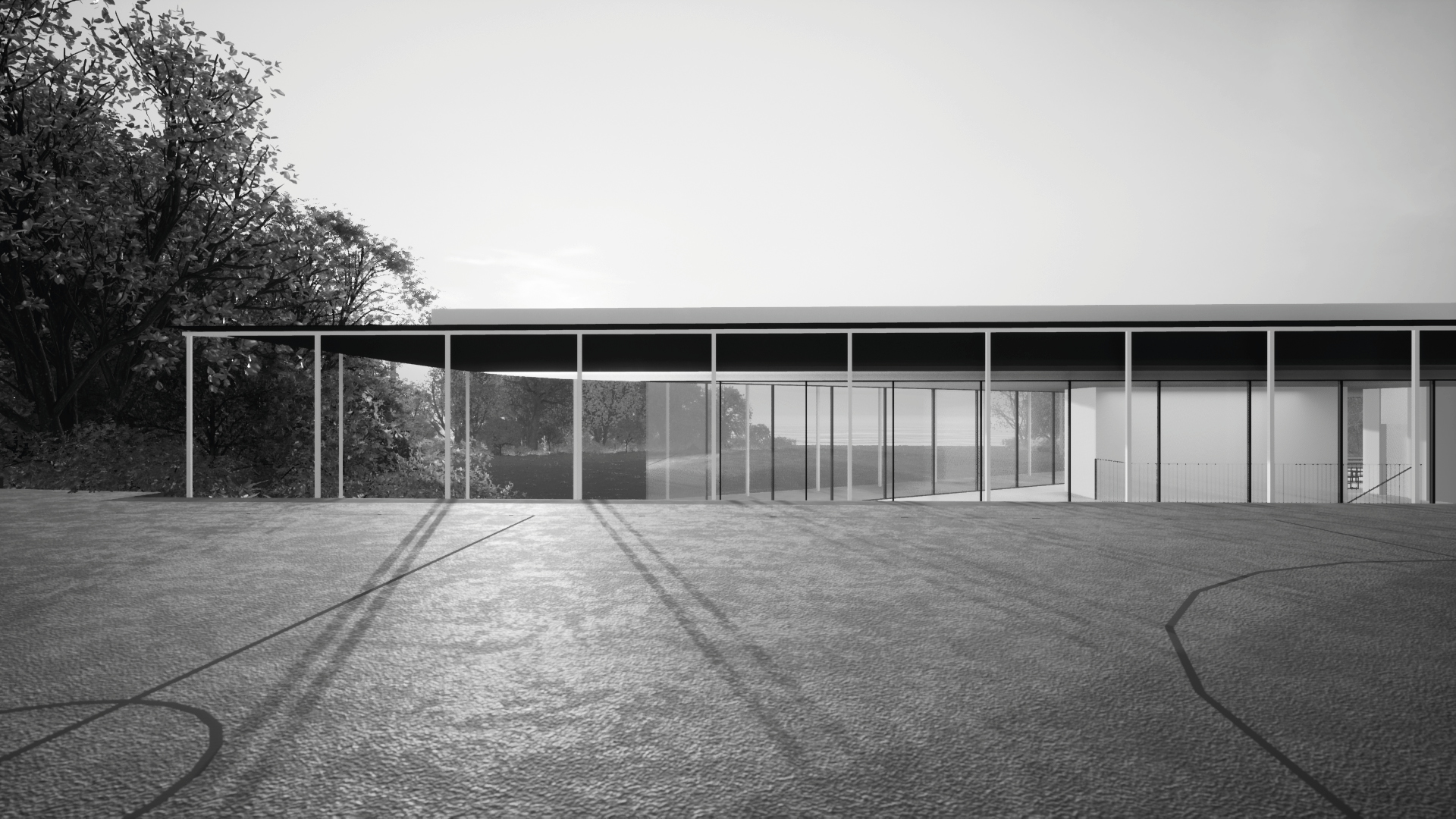 Taking the principle of a Miesian pavilion as the starting point, the proposal shows an elegant glass building sitting on an elevated site facing the water, but one which addresses the scale of the existing school buildings by sitting slightly lower to the rear by working with the site levels.
