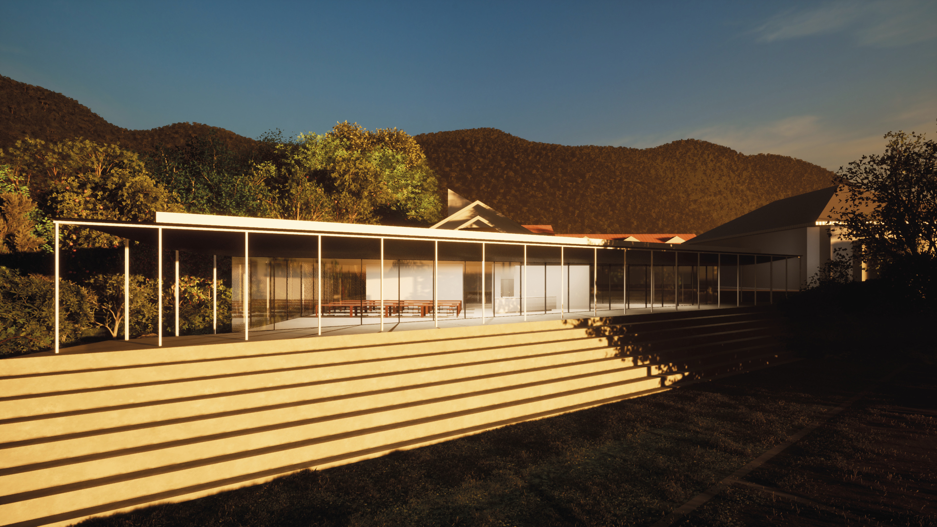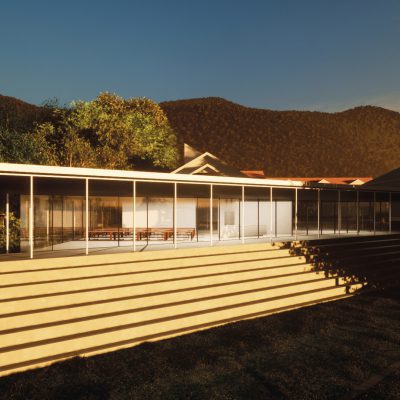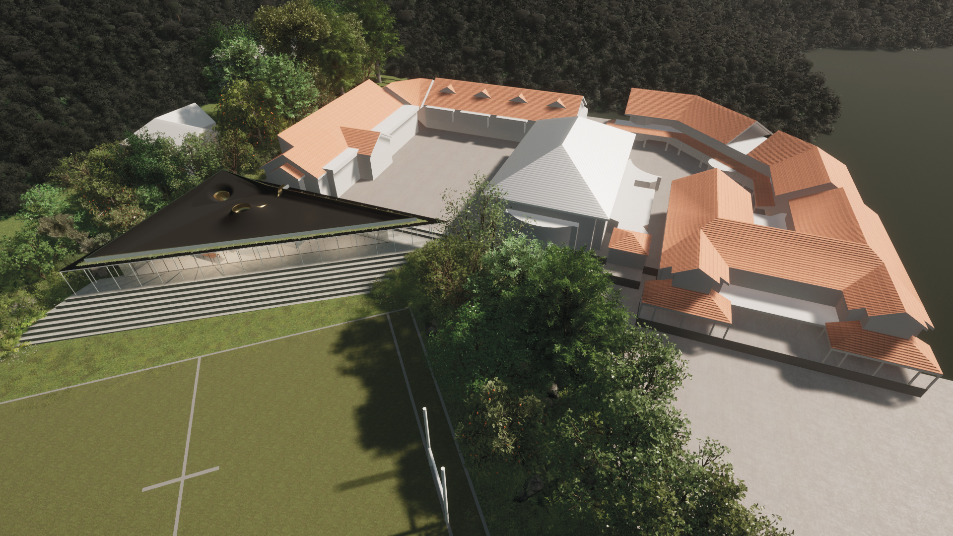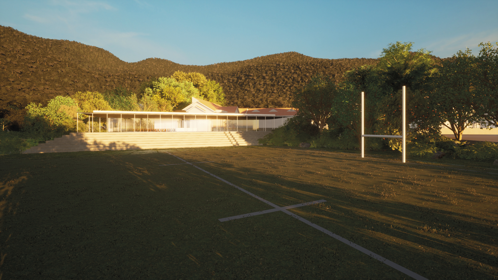 Taking the principle of a Miesian pavilion as the starting point, the proposal shows an elegant glass building sitting on an elevated site facing the water, but one which addresses the scale of the existing school buildings by sitting slightly lower to the rear by working with the site levels.