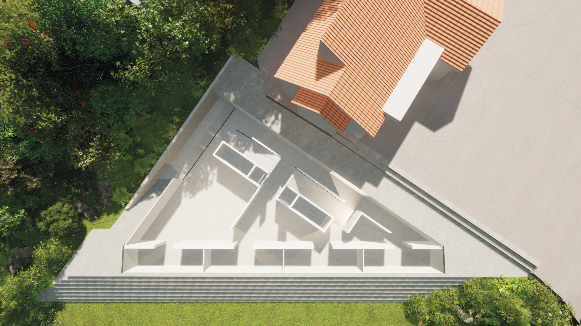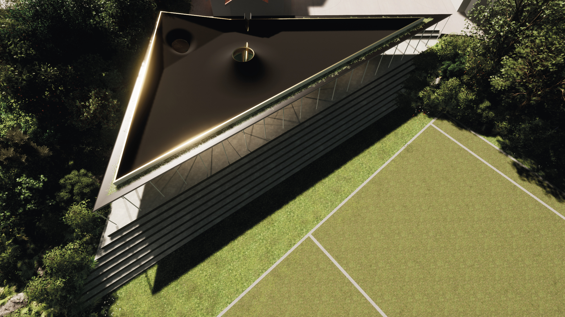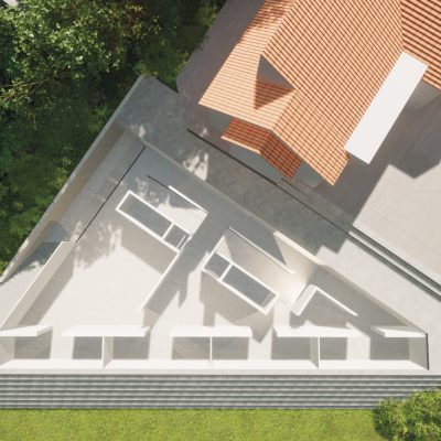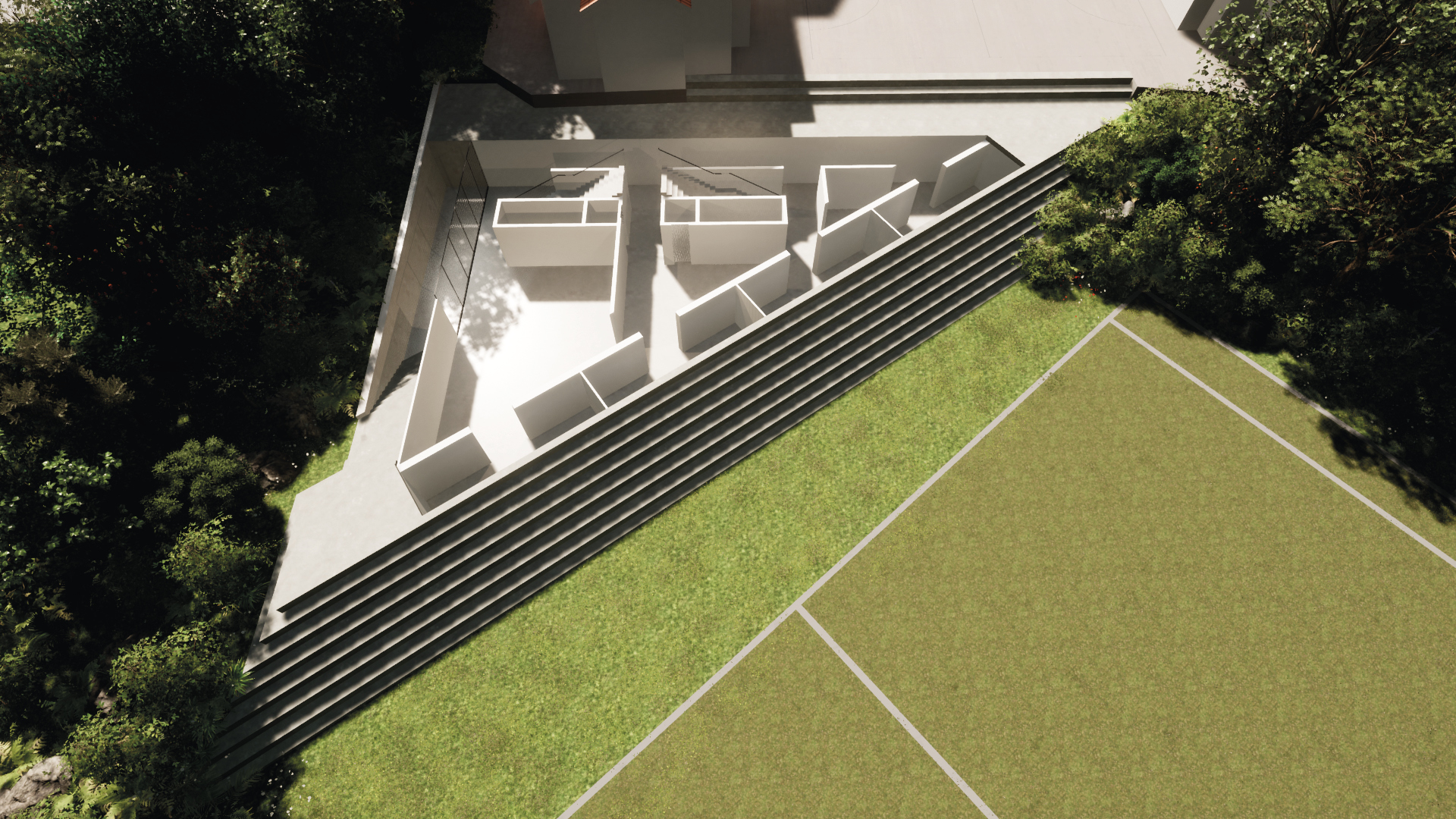 The roof is then given over to an abstract play area, where instead of it being for physical recreation, it creates a whole series of opportunities for ‘seeing’. Infinity edges carefully frame views around the edge, with curved inclined seating areas allowing for different perspectives. This roof area would be accessed from the exterior through a large freeform extrusion rather than traditional steps, using children’s rubberised play-surface material to make the whole space feel friendly and inviting, although access is still possible on the level from the existing first floor accommodation.