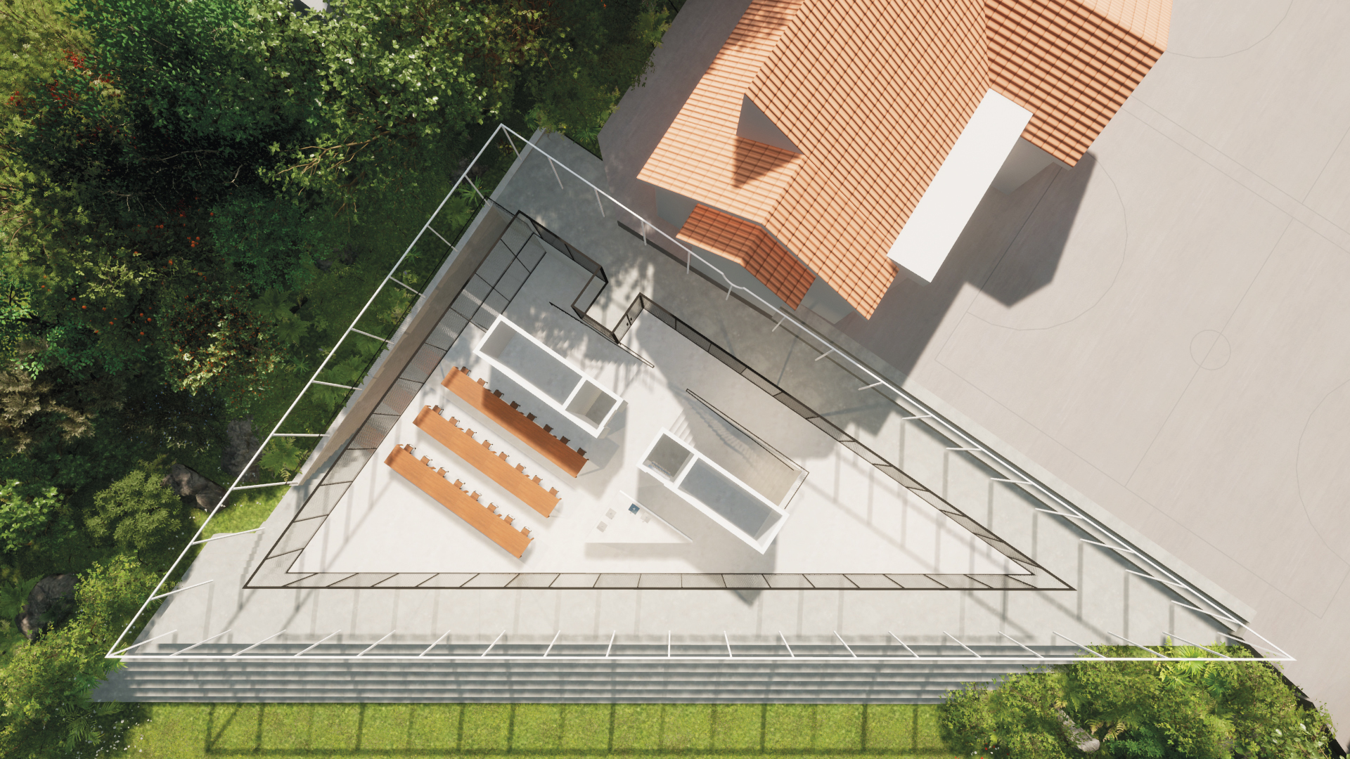 The upstand edge around the play area forms a slender linear strip, with the expectation that this edge would have a gently misting uplit evening glow, creating an ethereal edge to the roof of the building as a ‘long white cloud’.