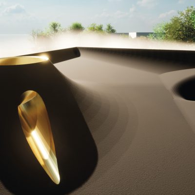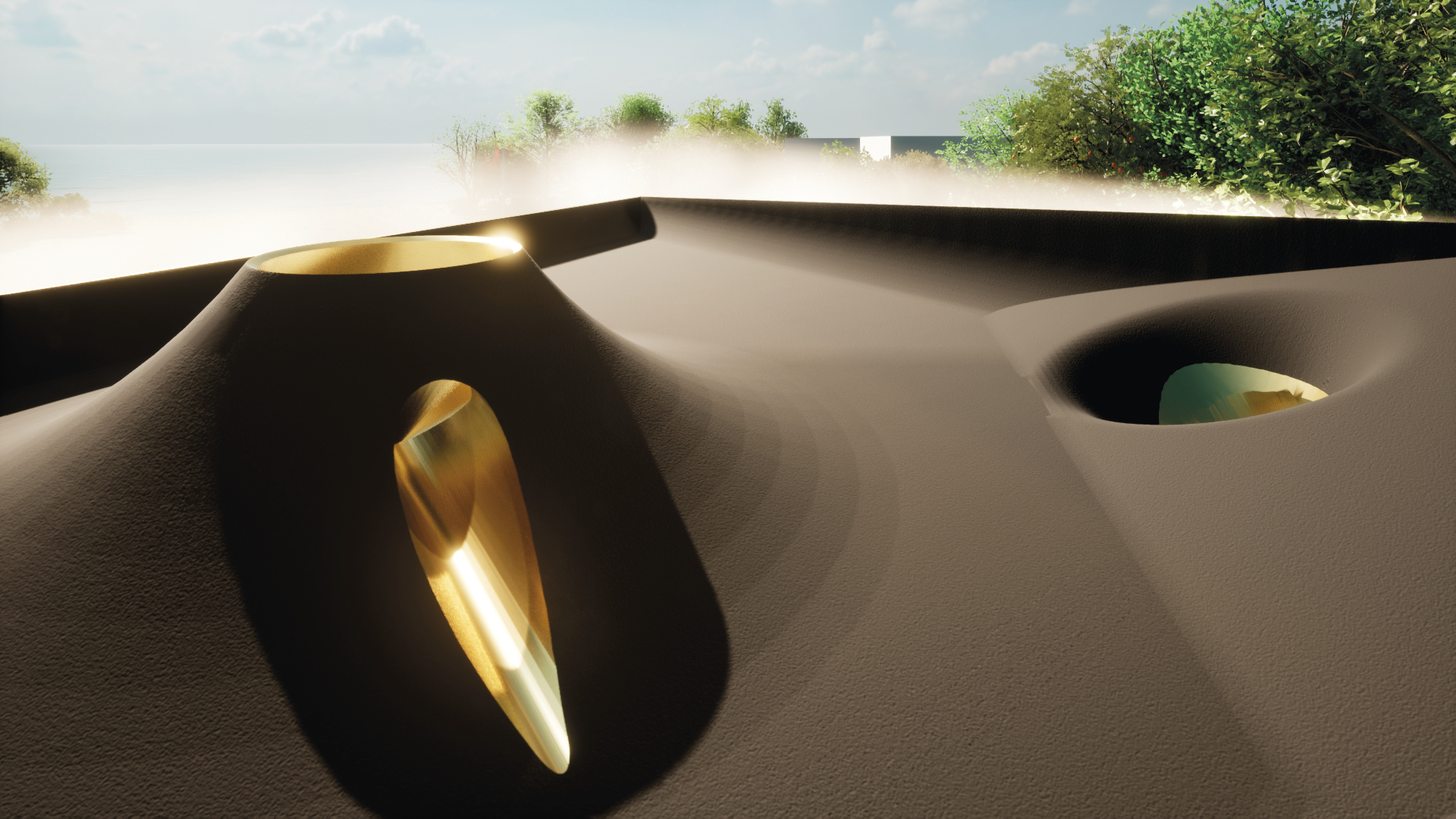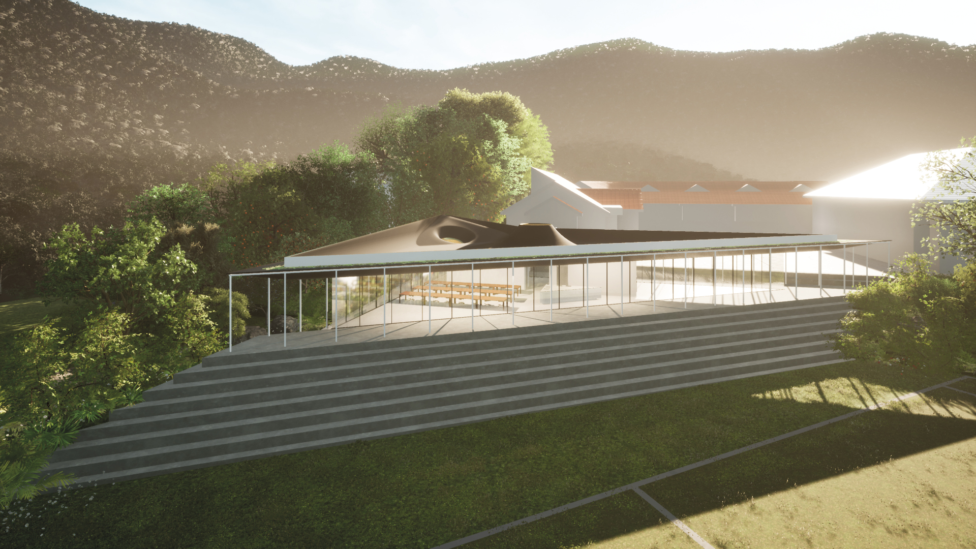 A large overhang creates a curved tapering edge, reminiscent of contemporary carbon fibre yacht hulls, which is then supported on a slender series of columns to give a balanced facade, and the whole pavilion sits on a stepped plinth.