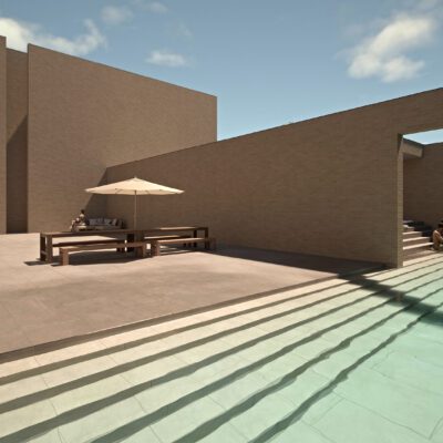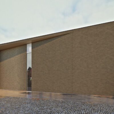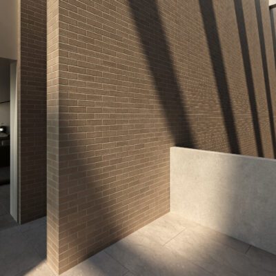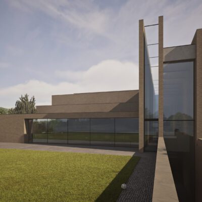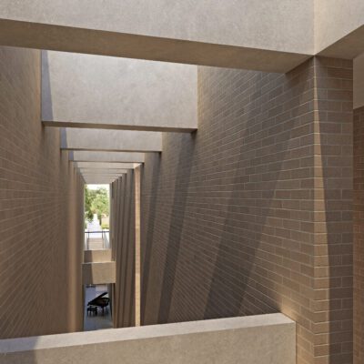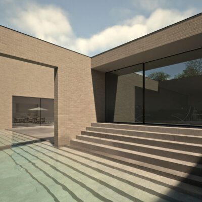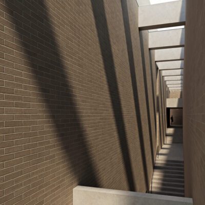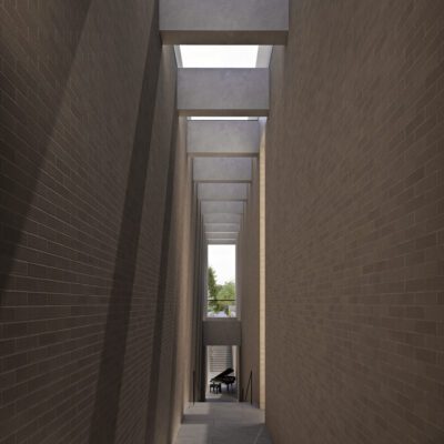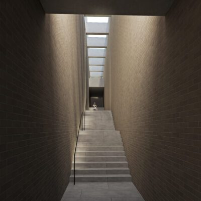 Wall heights are enhanced for drama, with glazed areas abstracted to read as voids against a series of flat plane walls.