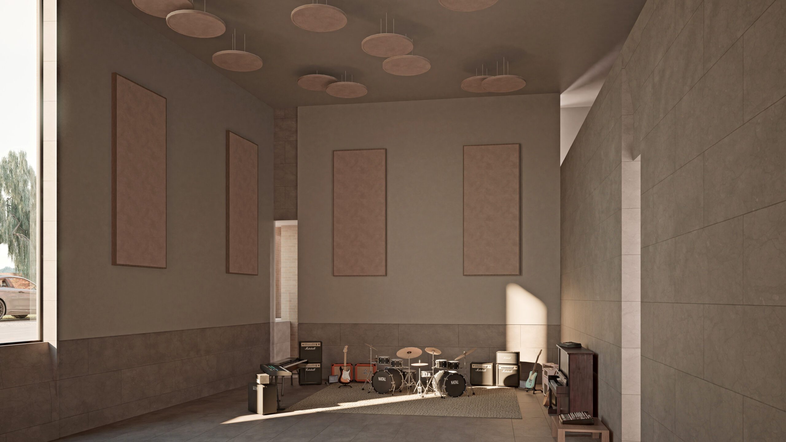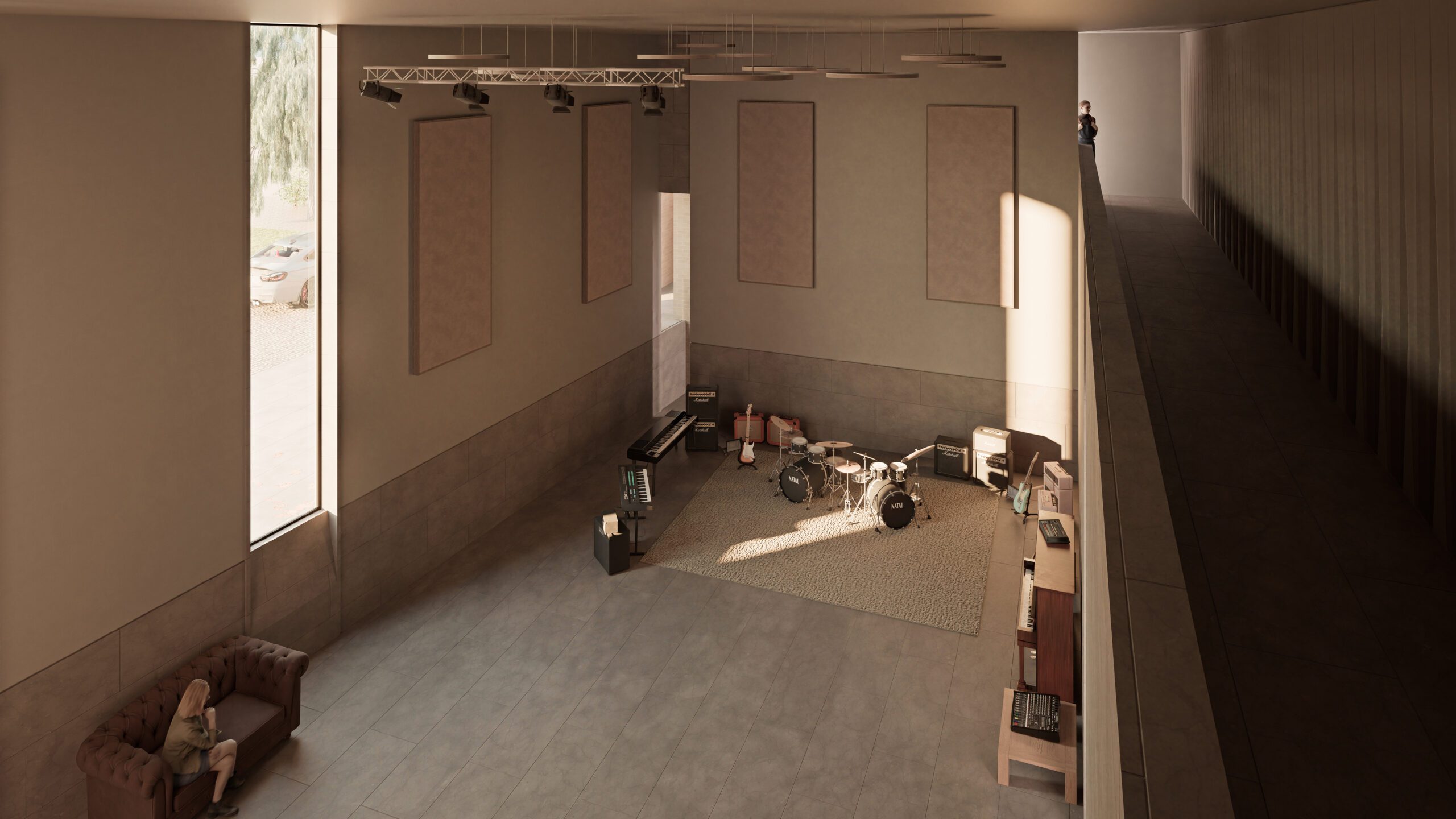 A musical family wished to create an exciting theatrical house which offered up various interesting spaces in which they could sing or perform. This was to include a large jamming room and recording space, but also several spaces where impromptu sing-alongs or performances could be undertaken.