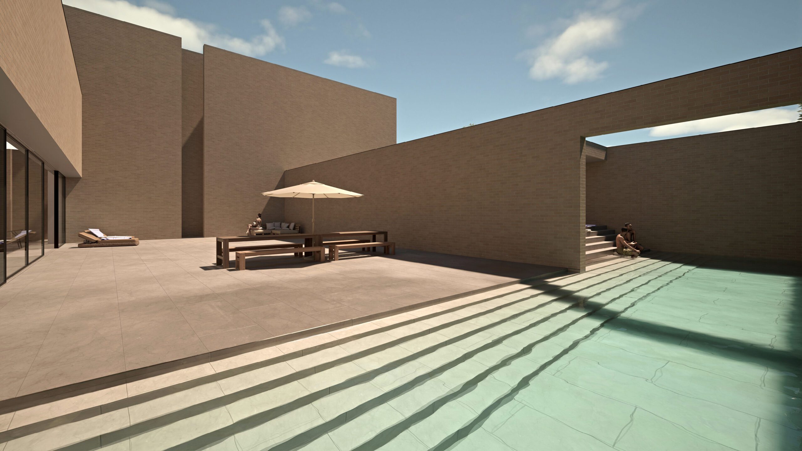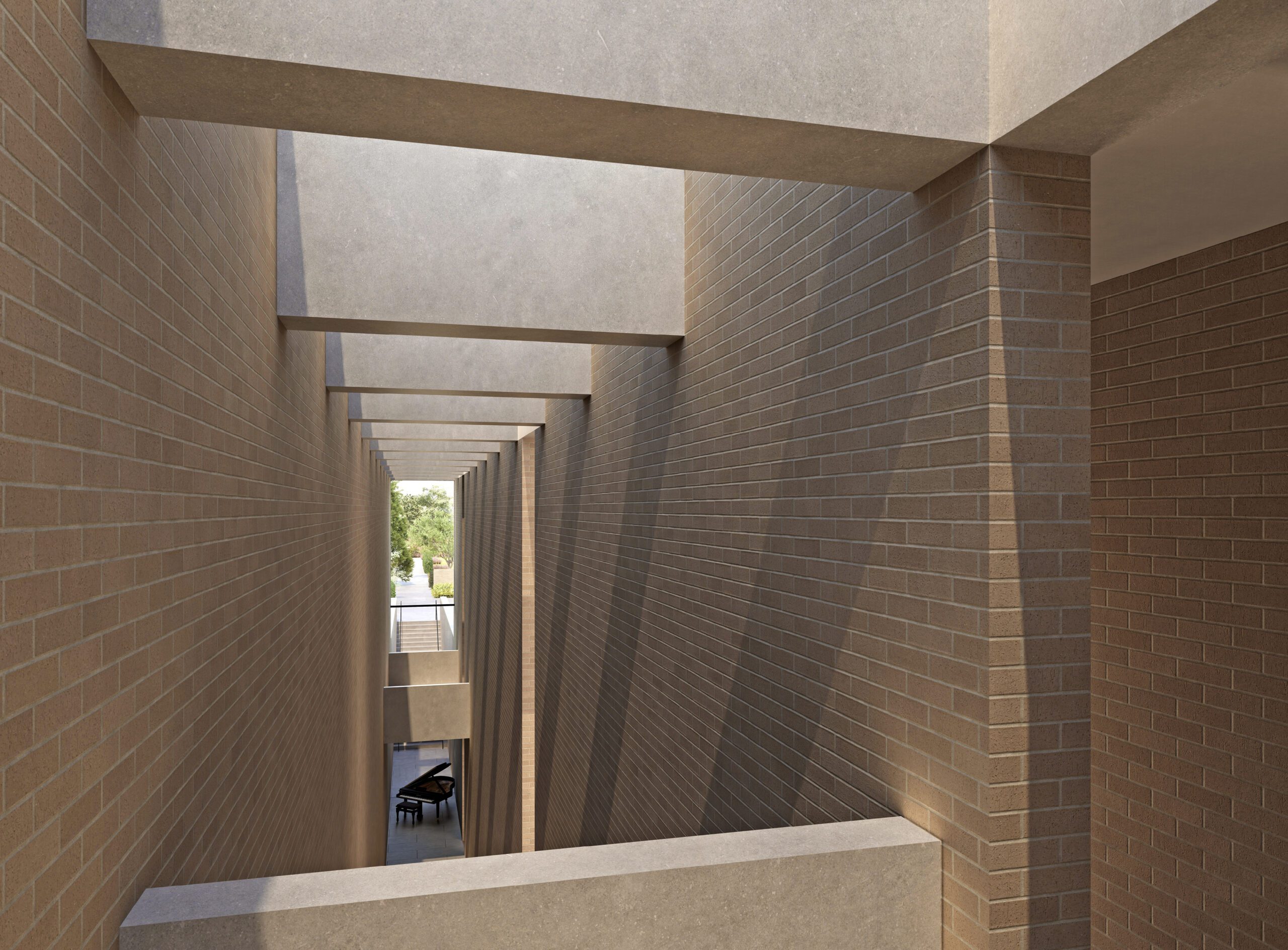 Wall heights are enhanced for drama, with glazed areas abstracted to read as voids against a series of flat plane walls.