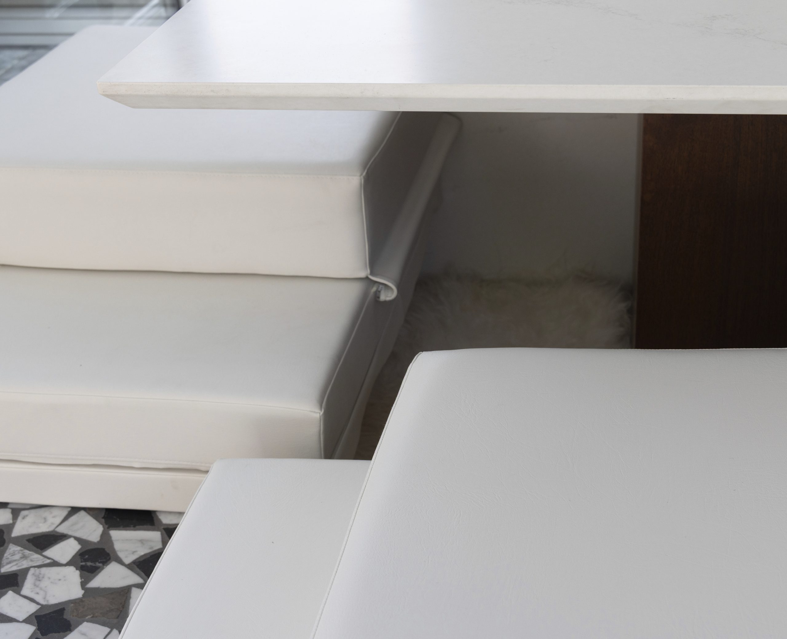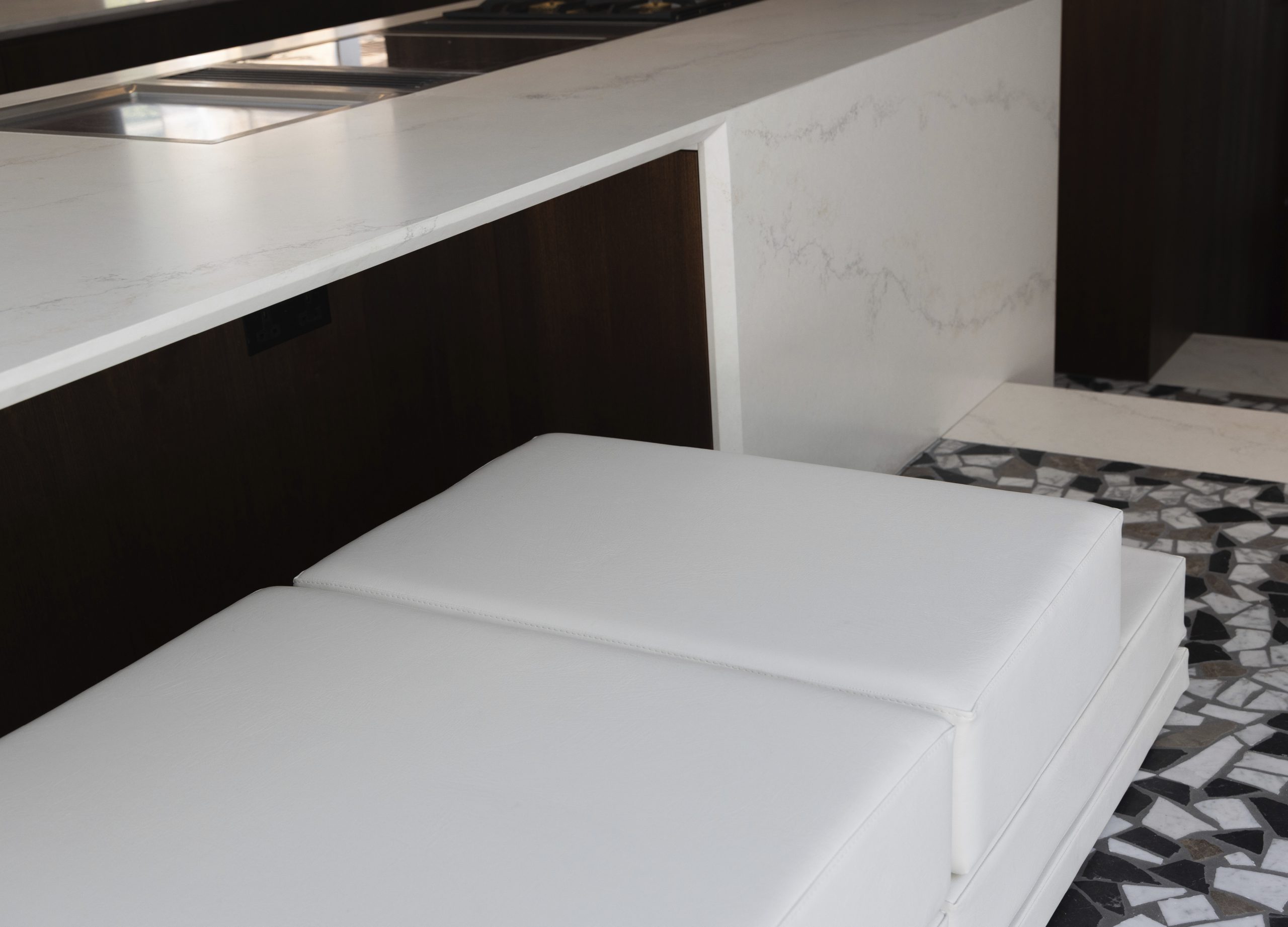 Cushions have been developed in conjunction with a yachting fitout company to create what appears to be a series of closed cupboards when not in use, but which fold down to create full size dining seats oversailing the edge of a sunken floor recess.