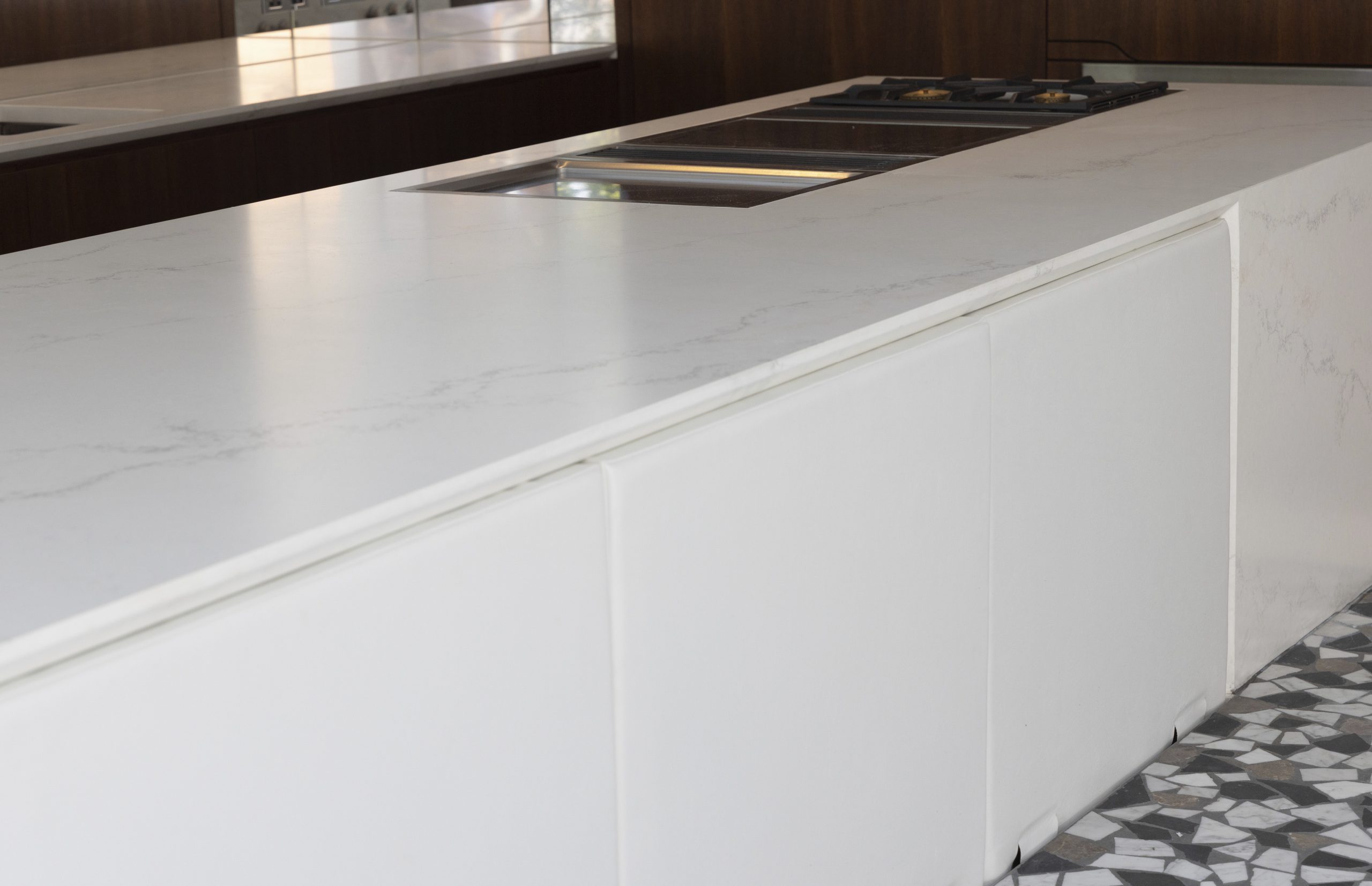 The end mirrored cupboard in the kitchen opens to create stowage for the remainder of the glazed enclosure, which can all slide around the corner of the kitchen to form an open vista to the terrace.