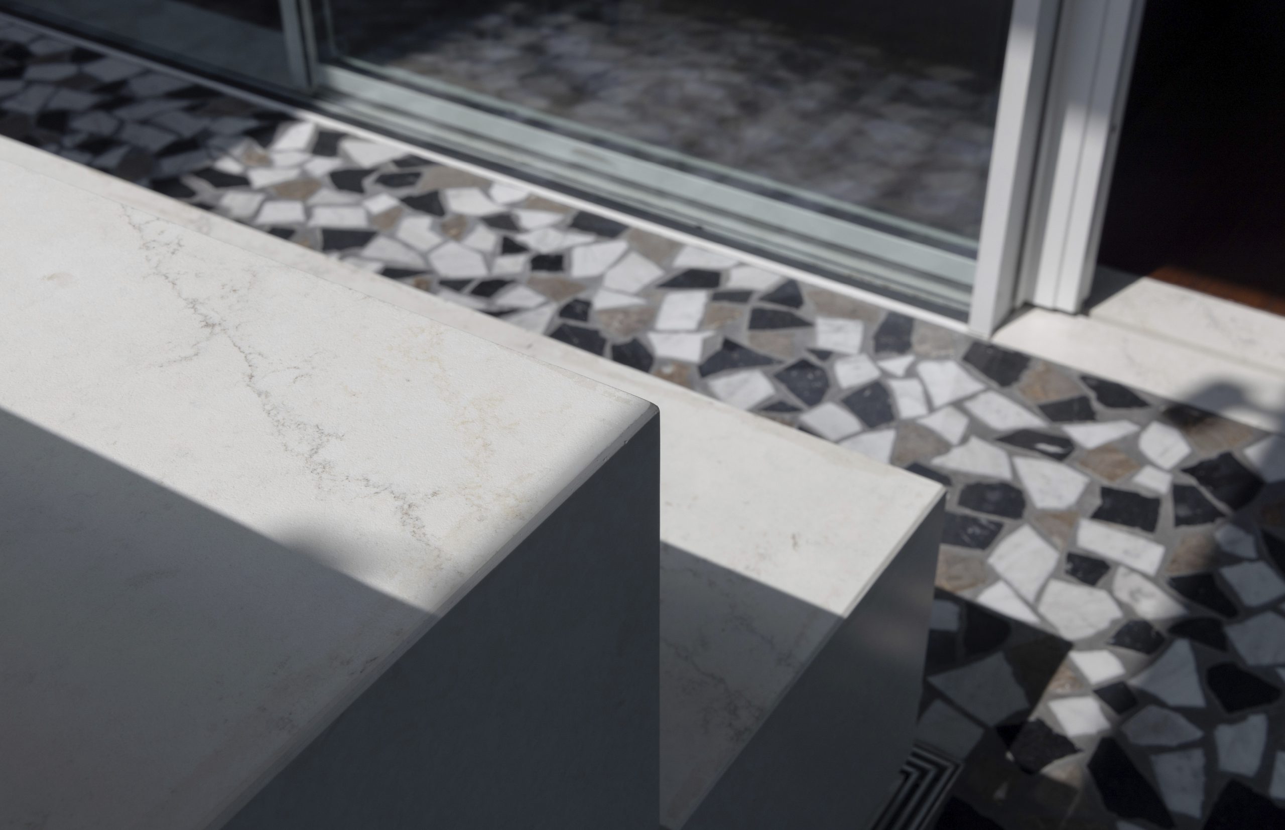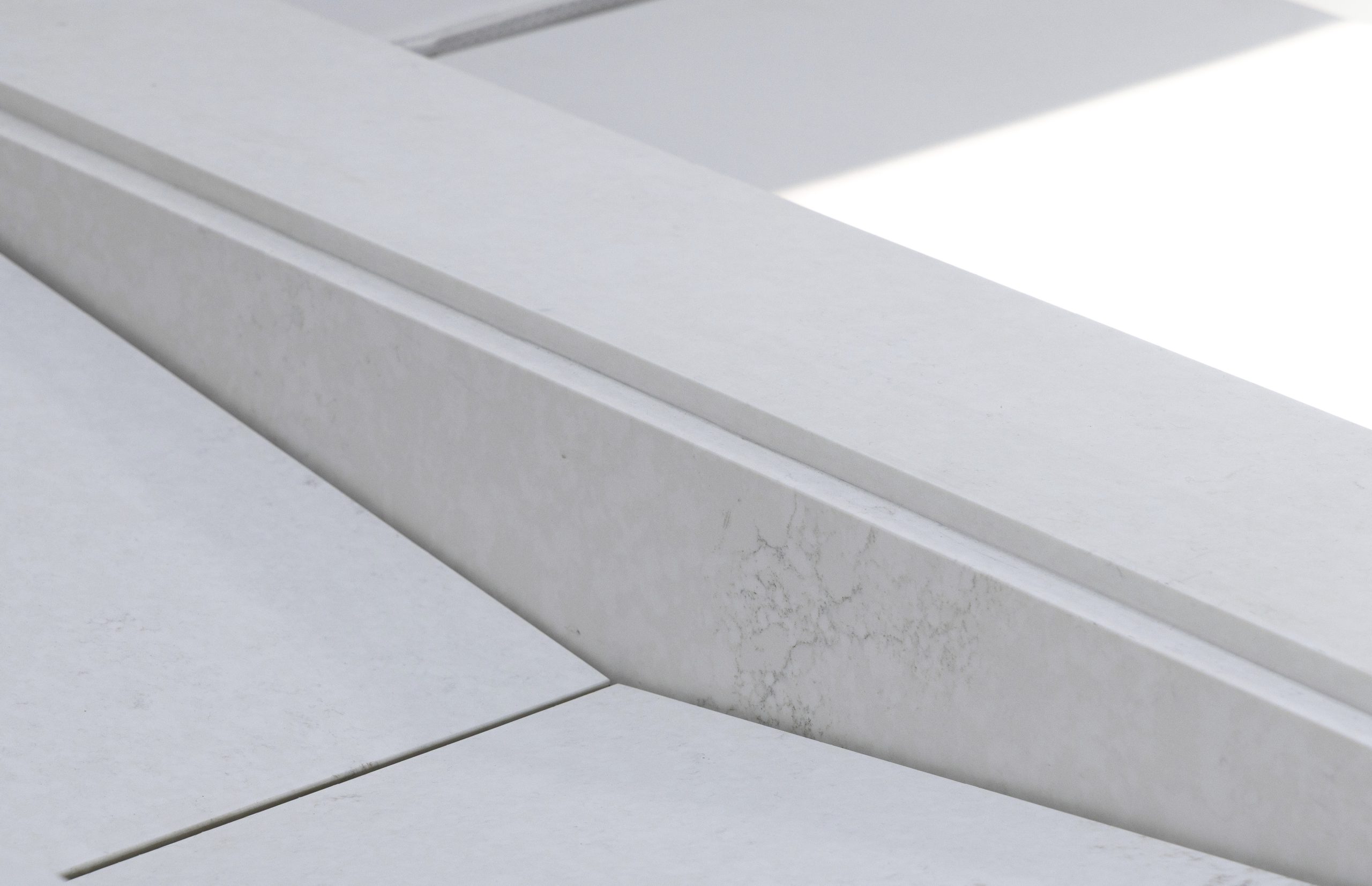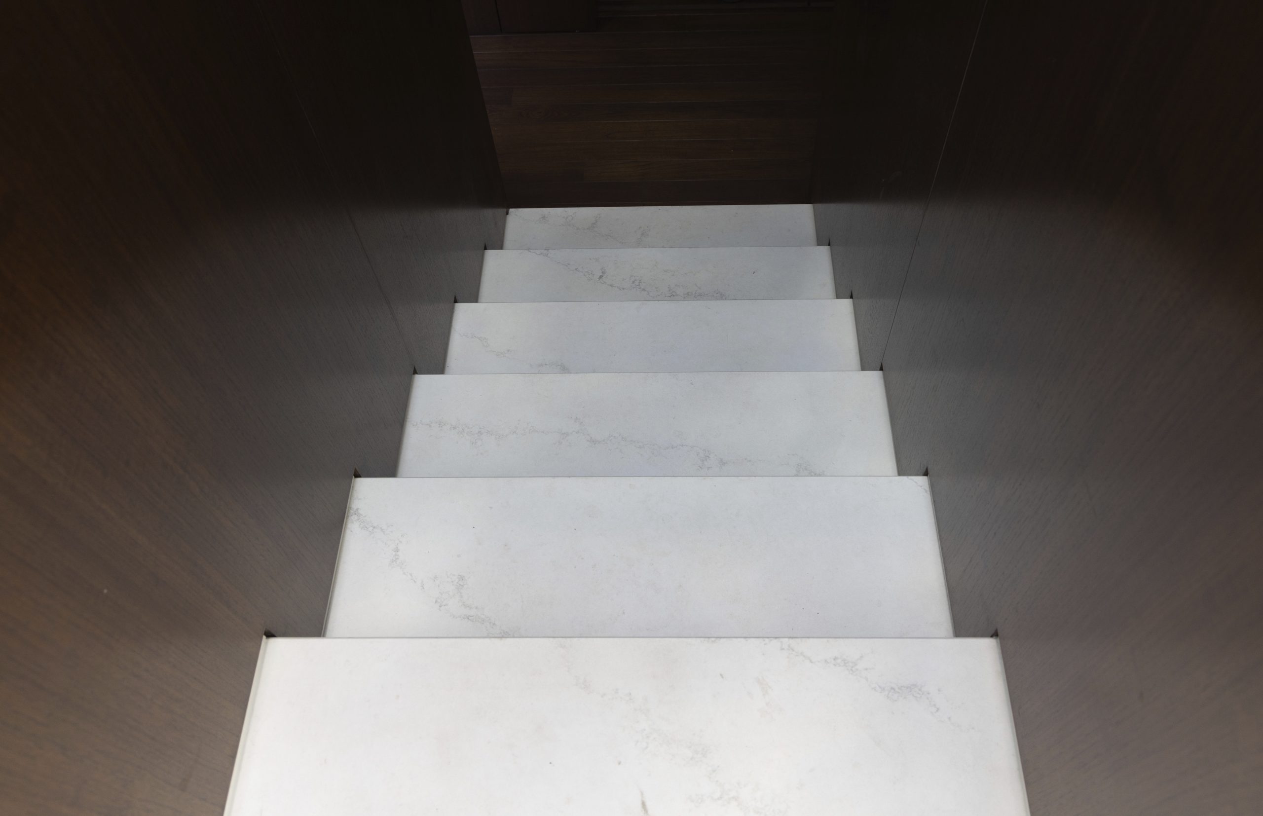 The ceiling between the lower accommodation and the upper room is shaped like an upturned spoon. The lower ceiling gently curves in a spline, smoothly rising above the steps to form a three dimensional shallow dome above the kitchen island, with all edges then returning to horizontal. This serves to transition the levels with what appears to be a continuous ceiling.