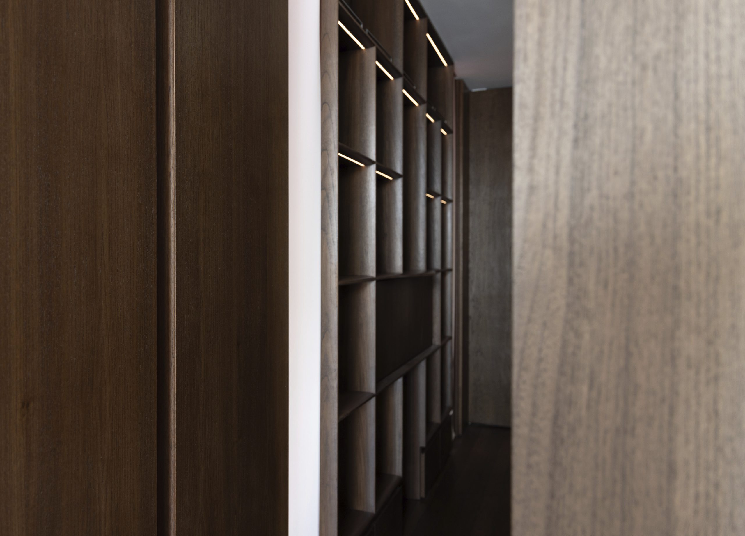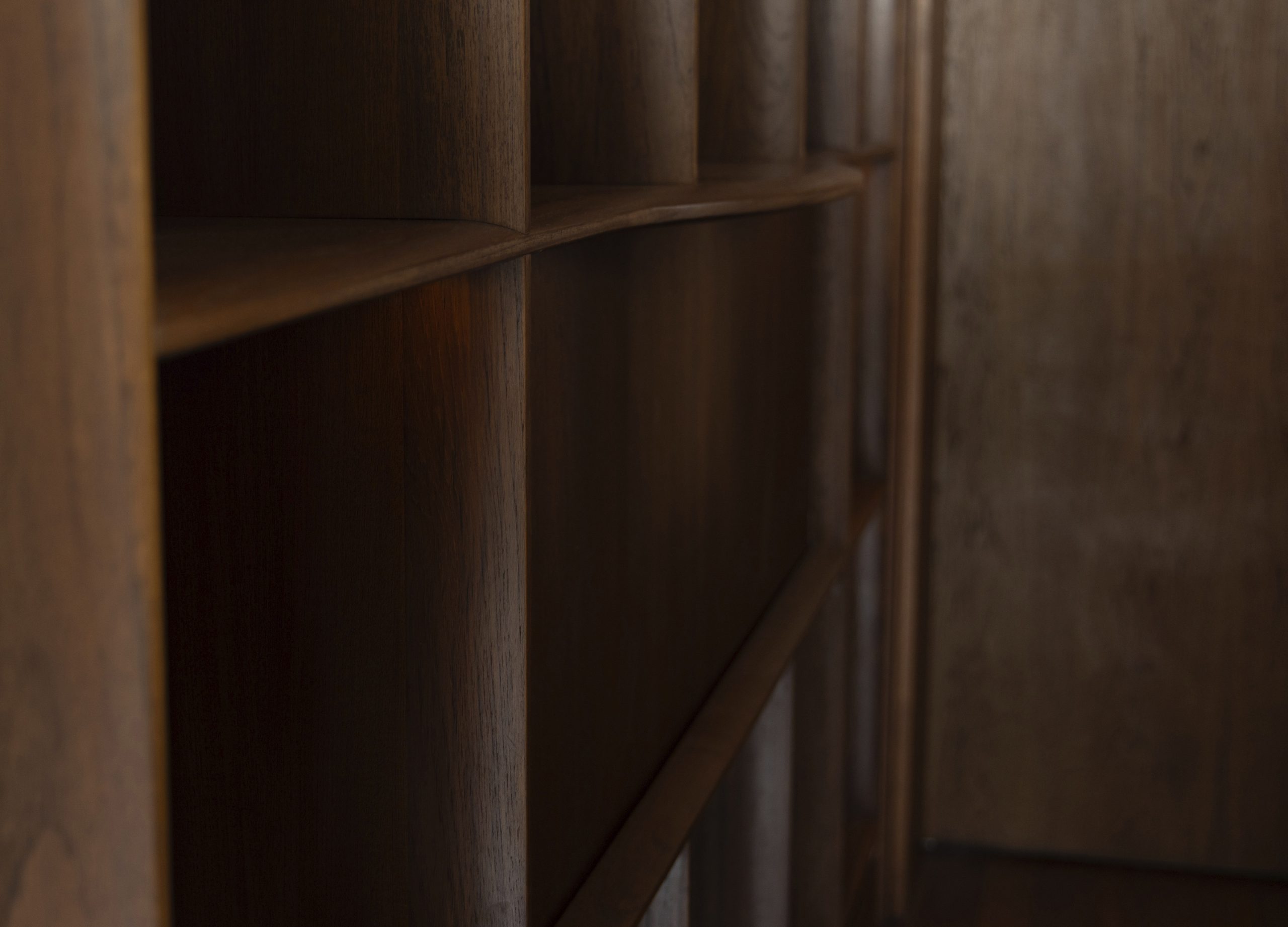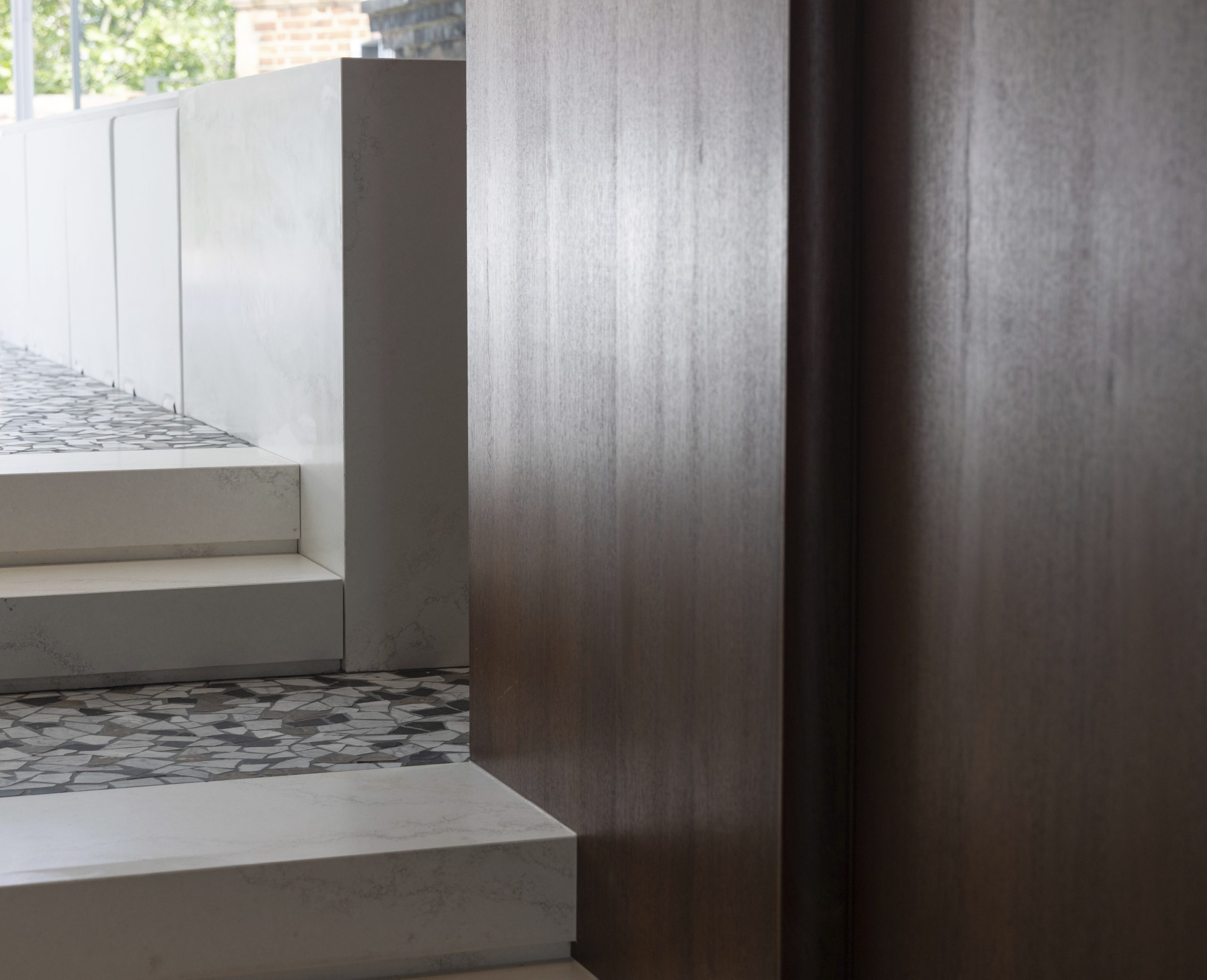 The existing mansard street facade is abstracted into a piano key series of vertical slots, with the existing fenestration sitting behind full height veiled window recesses. The rooms are accessed along the length of a glazed wall, with the mansard wall then separated from the return walls between rooms with a series of gaps, allowing a flexible and open plan configuration when required. The whole interior is then formed in joinery.