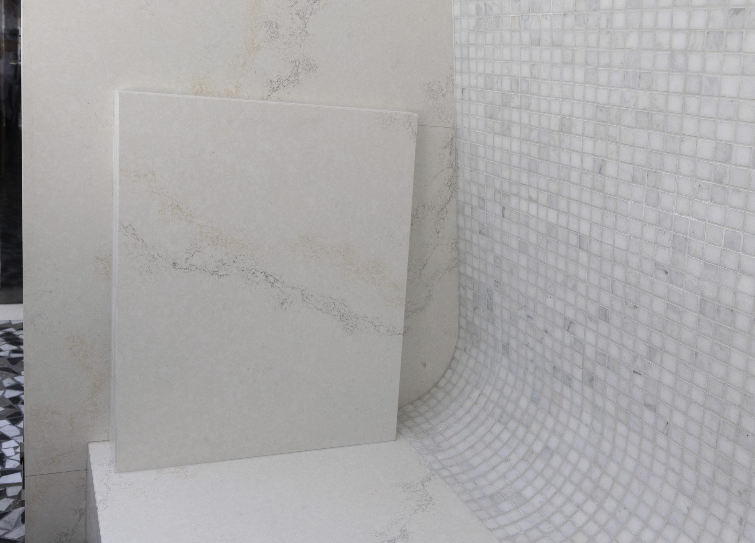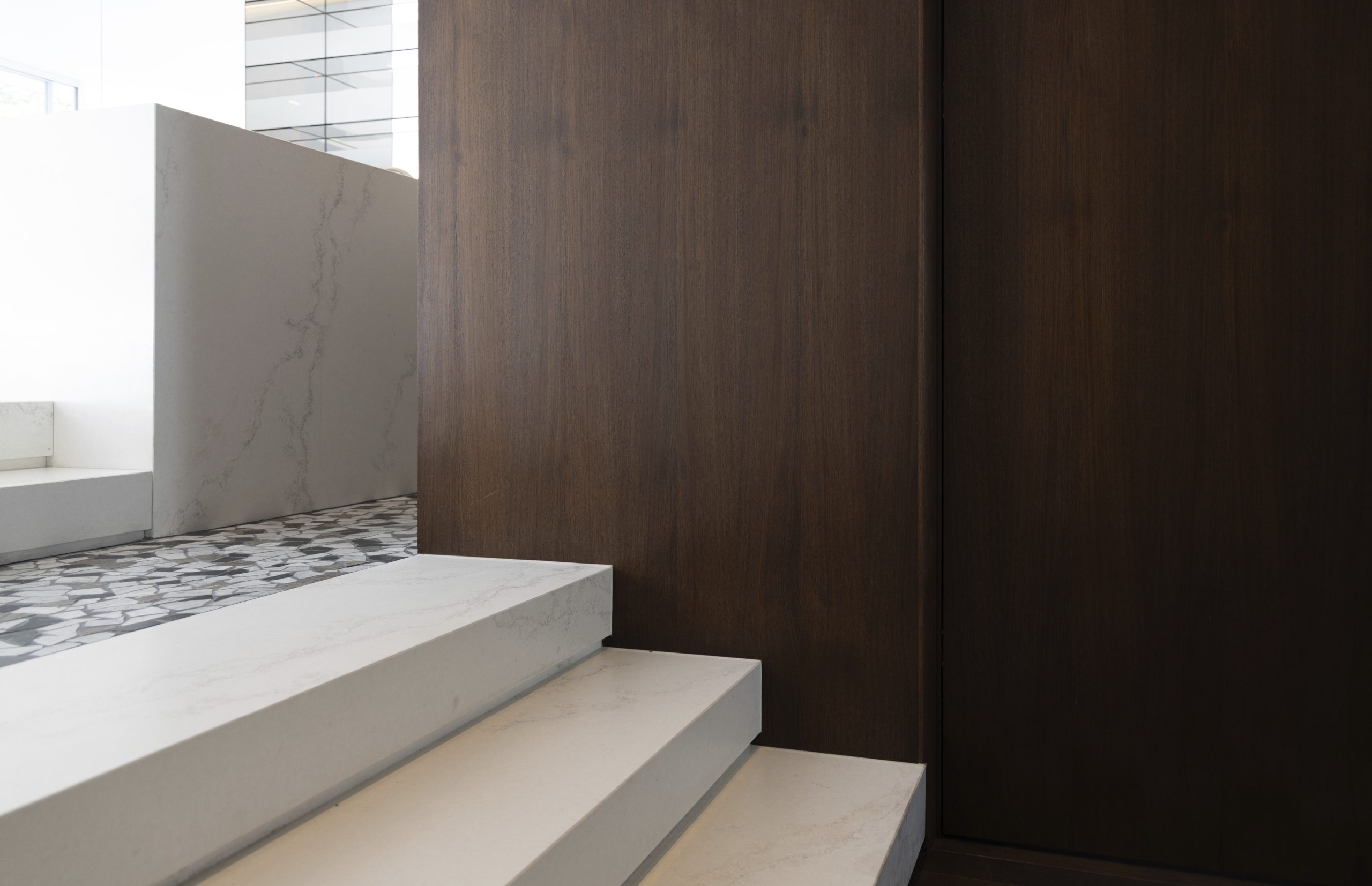 Hidden behind two folding Corian doors sit a pair of urinals, with the doors serving to provide privacy across the window recess when in use. A WC is then discretely located in a mirrored enclosure behind the steam room.