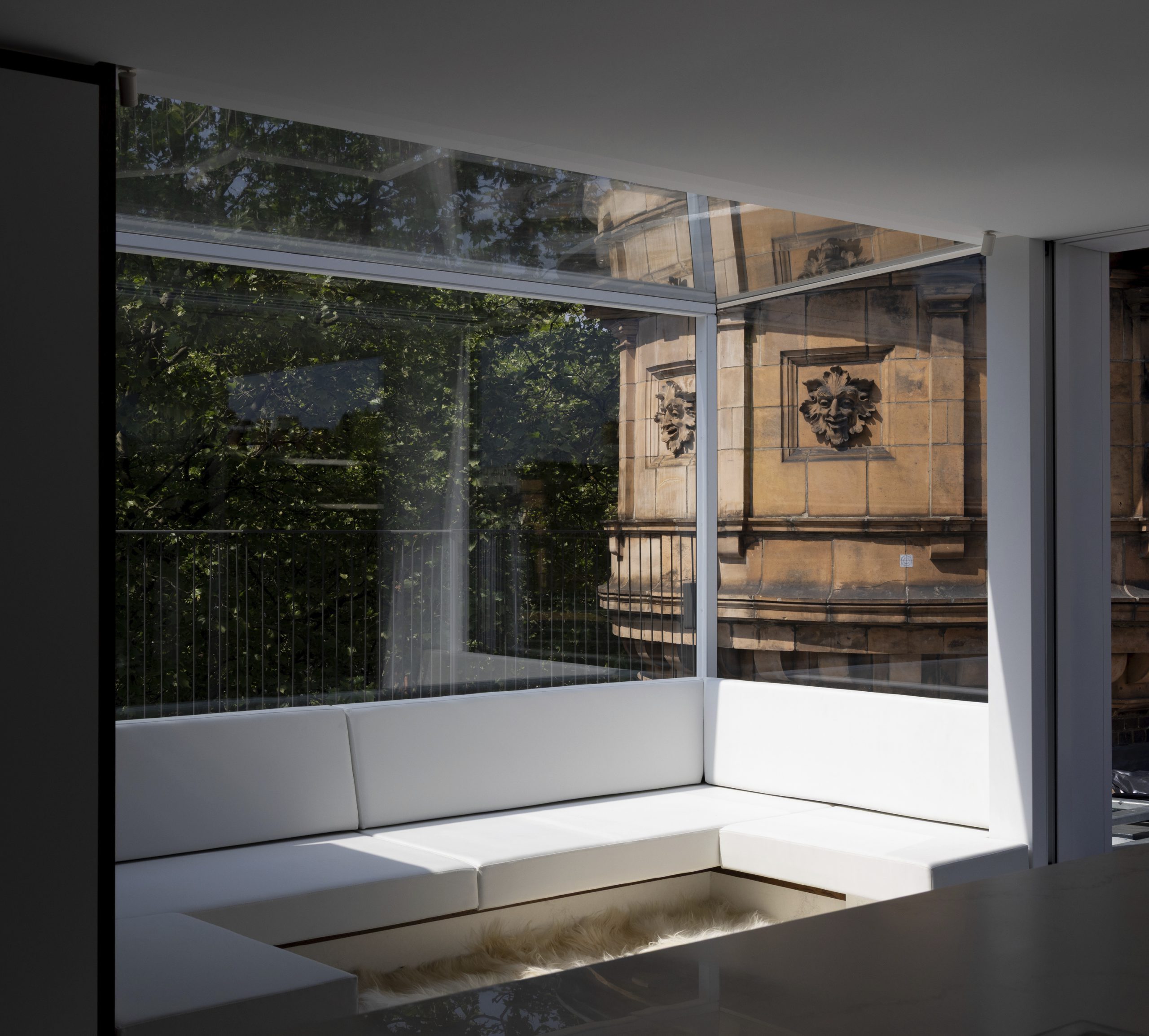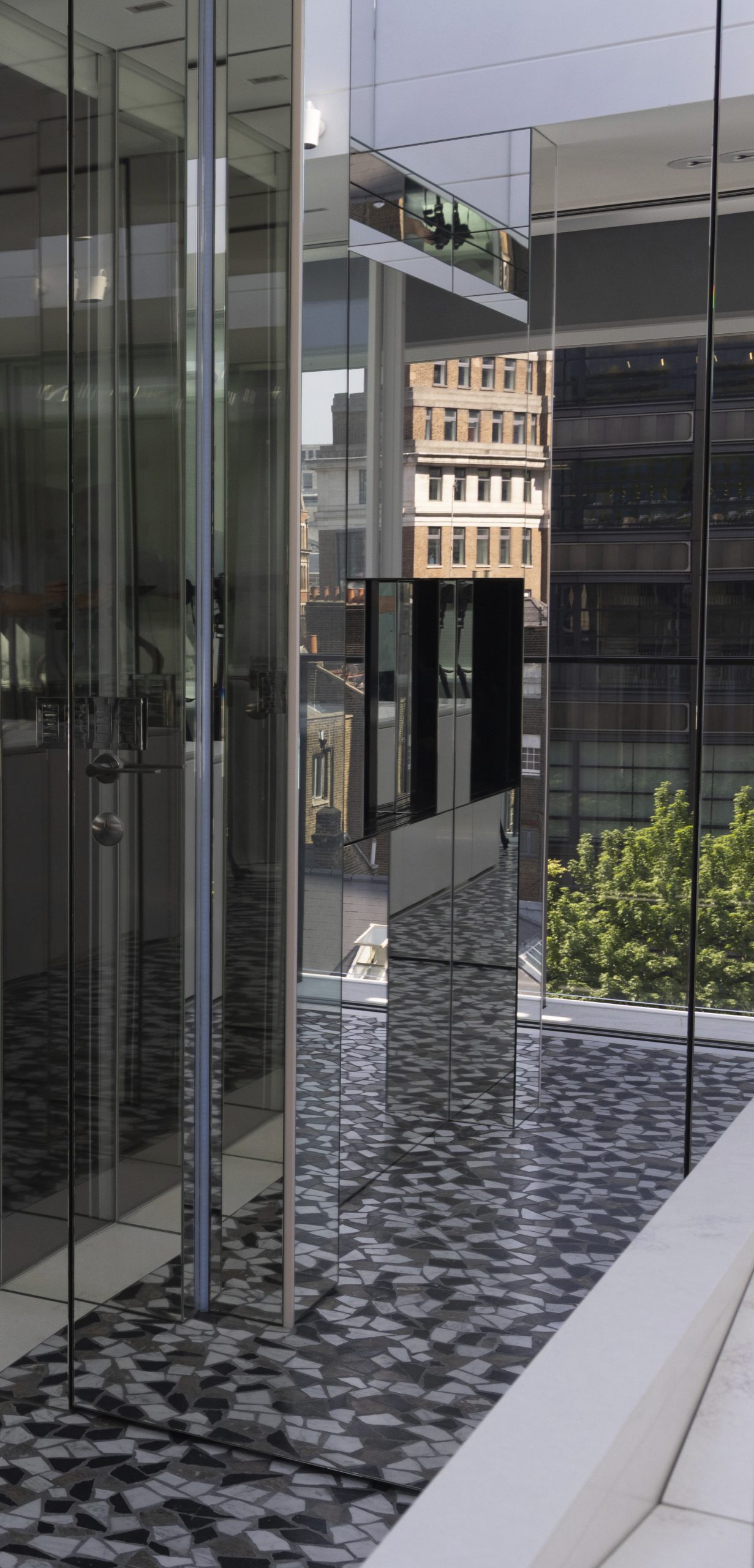 The main reception space is accessed up a series of steps, with a kitchen and lounge area appearing to be sitting on the external terrace. A frameless glazed box enclosing the sunken seating for the lounge provides spectacular framed views of the tourelle which is a part of the historic building, whilst appearing to be sitting on the floor, and a further fireplace sits within a timber mantlepiece at the other end. The kitchen floor steps down to provide sunken dining seating on one side and full kitchen functionality on the other. A fully mirrored rear wall has a series of glass shelves with lighting above to create a fractalized chandelier.