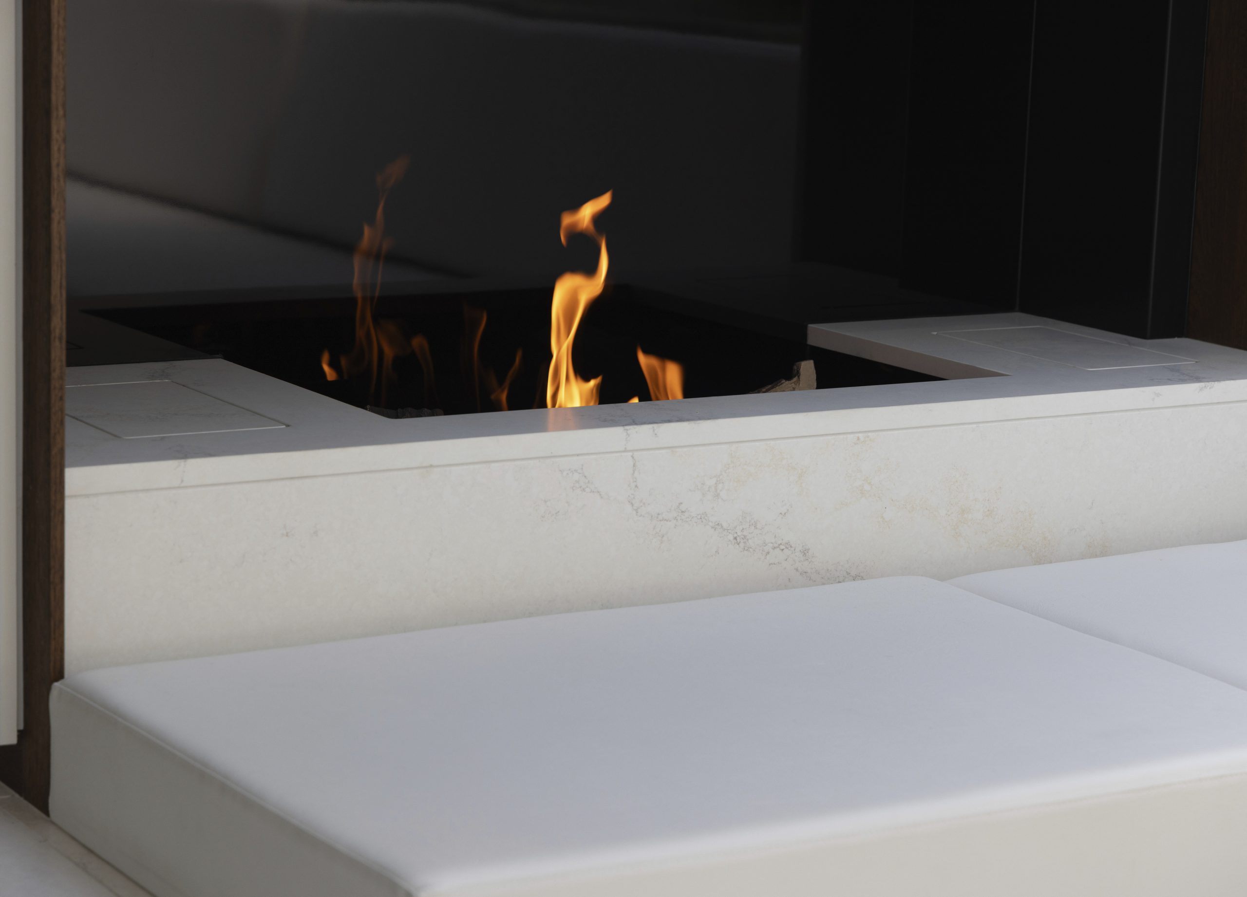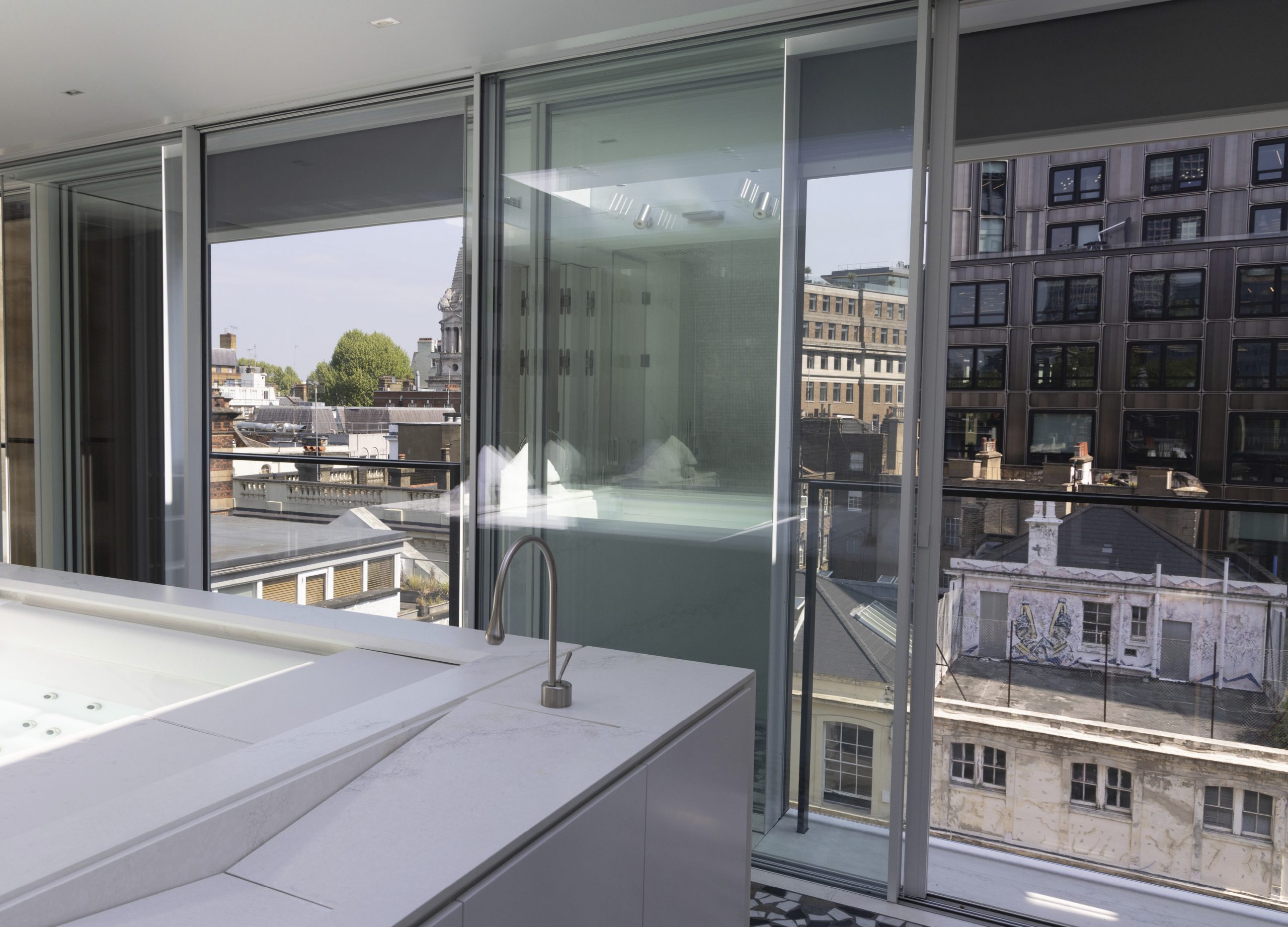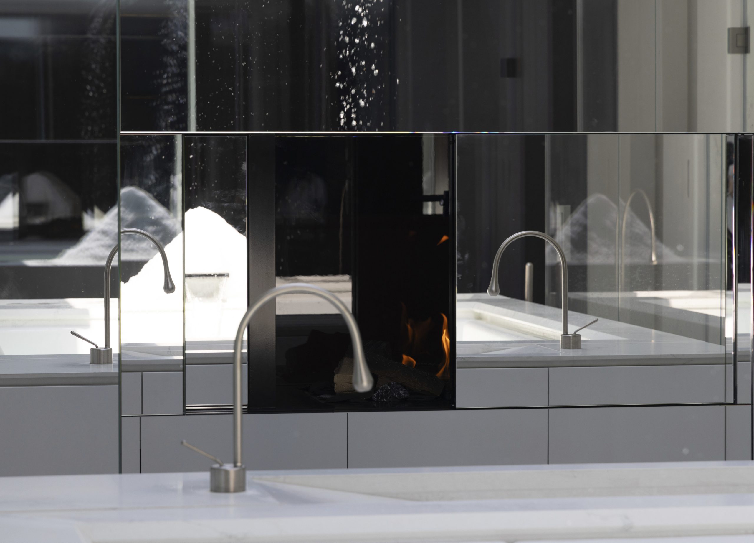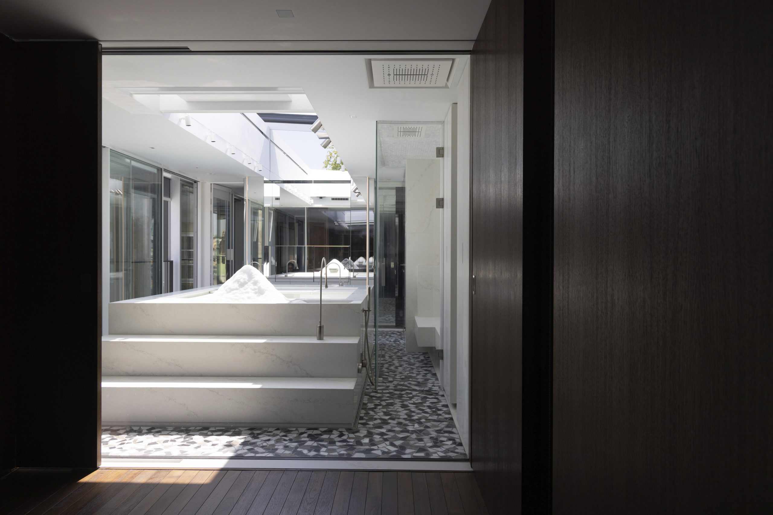 The centrepiece of the apartment is a large spa zone, with a fully retractable rooflight over a spa pool. This pool has been designed with a series of formal steps providing seating by the pool. A series of ceiling showers are installed around this area, including in the adjacent steam room, which looks out on the pool. Sinks and vanity units sit at the other end of the spa pool adjacent a fire which separates the spa from the master bedroom. This in turn sits within a large mirrored planter which will also allow plants, including flowering Bougainvillea and Jasmine to grow along the edges of the rooflight.