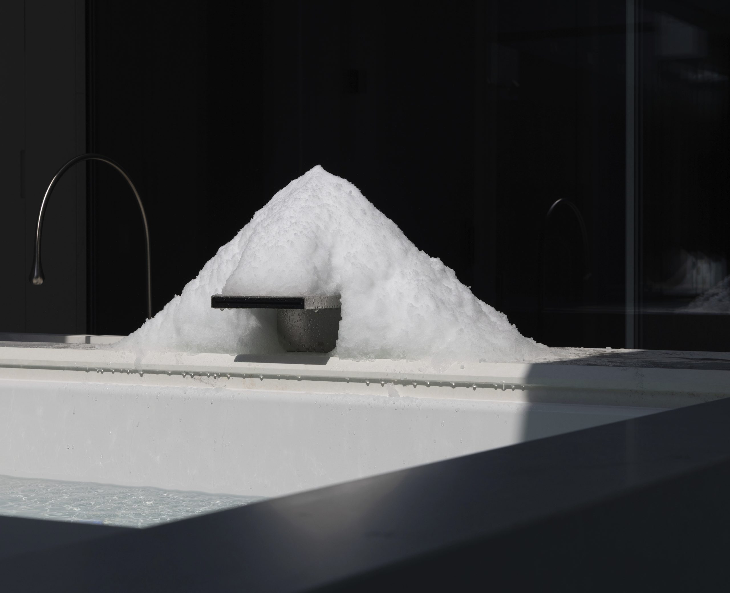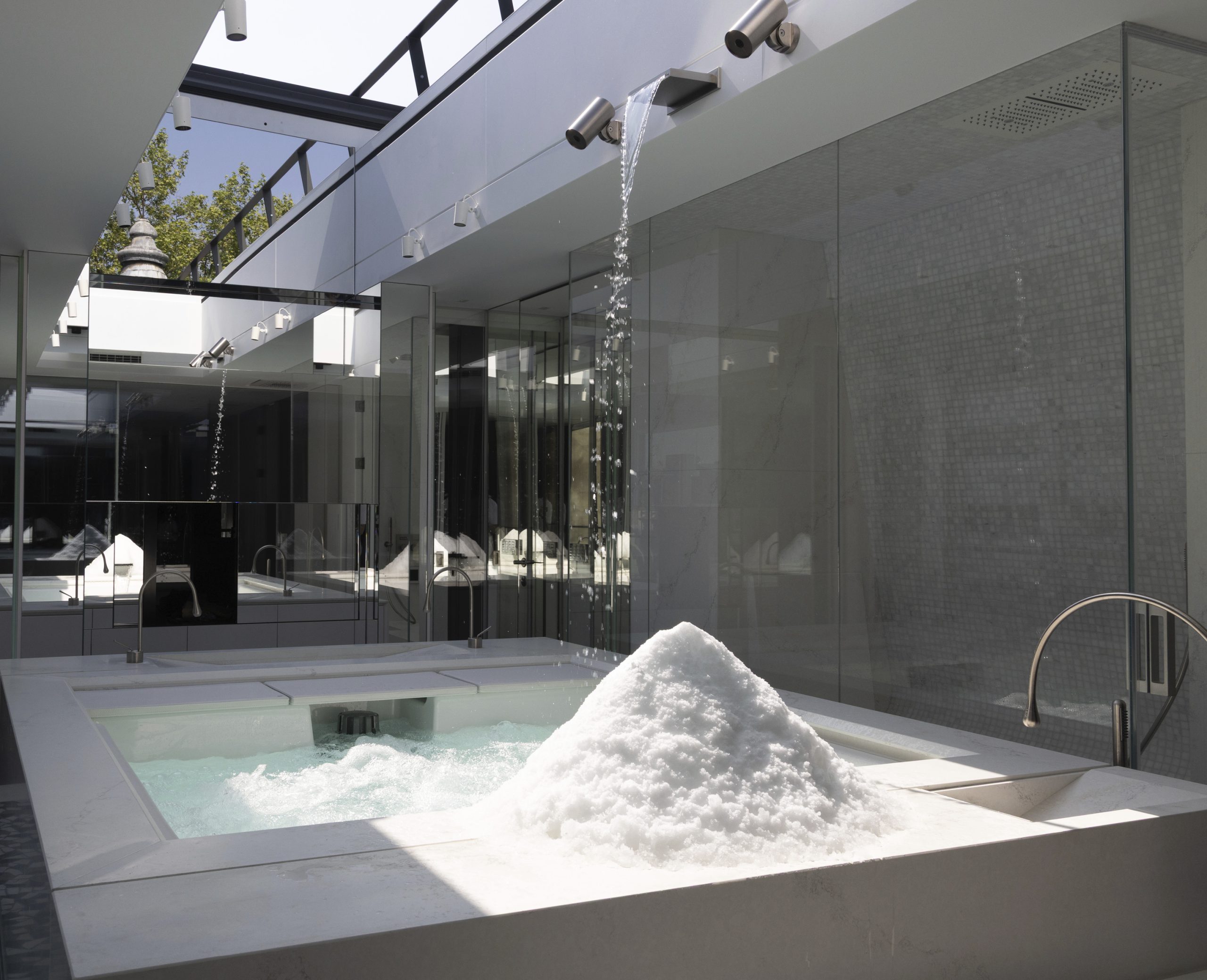 The spa pool can be filled using the adjacent tap, but it also has a waterfall outlet at high level in the rooflight for drama, along with some nebulising showers. Perhaps the most spectacular introduction is a snow machine which has been mounted high in the rooflight upstand to produce snow when required, which then falls gently on to the spa pool and step area, whatever the ambient temperature, and whether the rooflight is open or closed. The steps have a series of heated elements to allow the snow to either settle or melt. A further tap is then located on the steps to the spa pool for hand washing, also providing purified filtered and chilled drinking water.