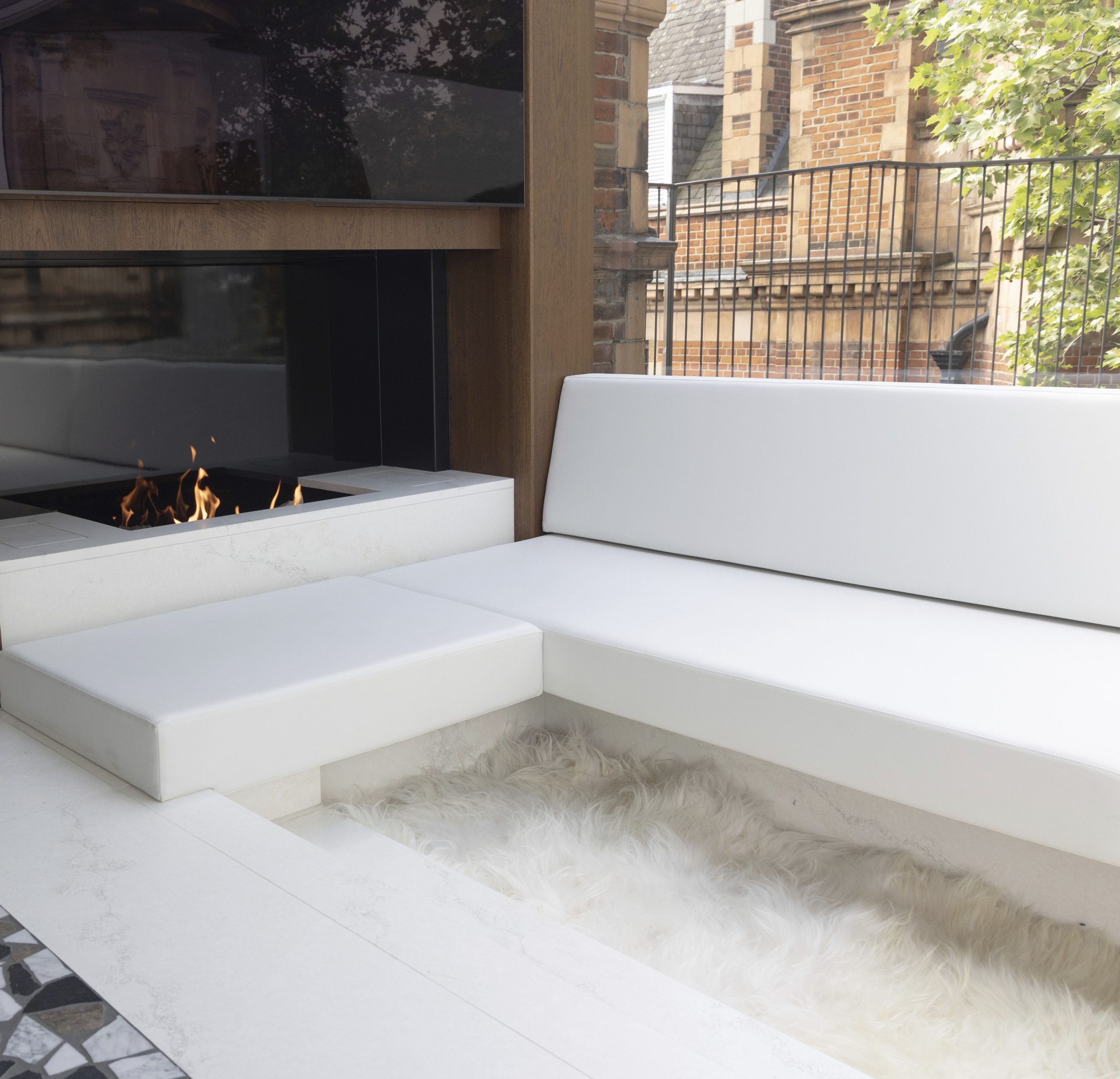 A series of external rooms have then been created on the terrace, with sunken lounges, floating benches, dining spaces and a kitchen sitting within the English Country Garden.