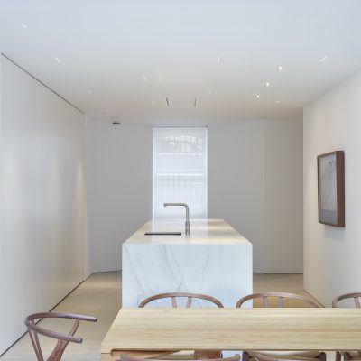 A straight flight from the upper ground floor reception down to the kitchen and family space was clad in the same stone floor as the reception spaces to maintain robustness, with the stone flooring then continuing externally to increase the feeling of space.