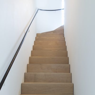 The handrail was carefully considered, and the decision was taken to introduce a rustic feel as a foil to the refined walls and floors. This was achieved by using a solid iron handrail which had to be formed on site through a process of heating and bending it to fit. The end result looks fantastic and forms a beautifully tactile handrail.