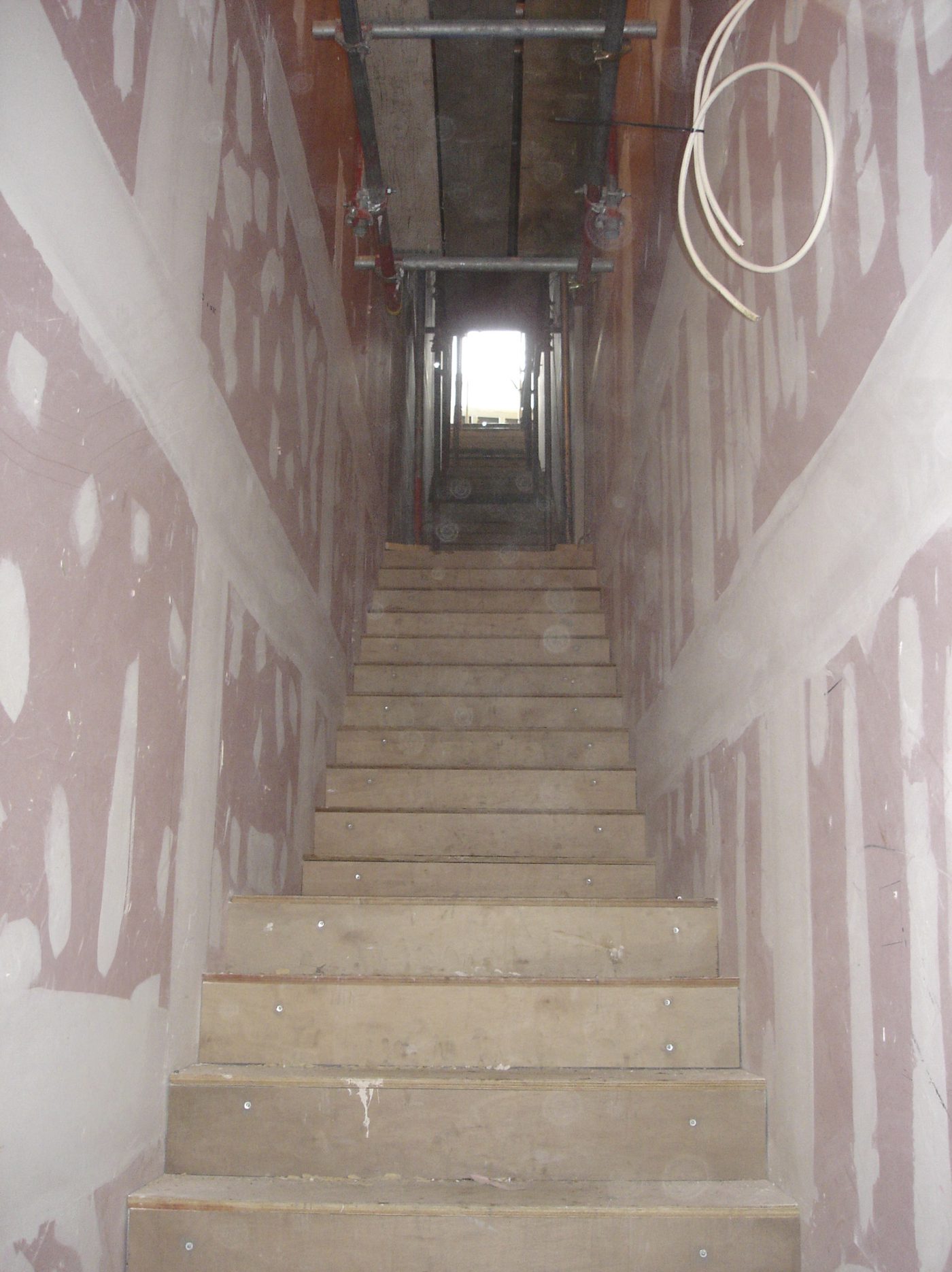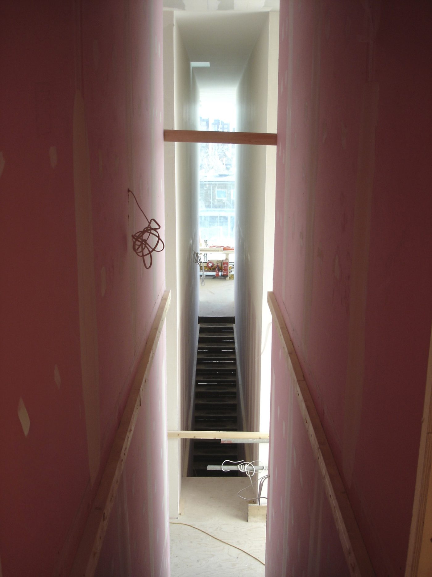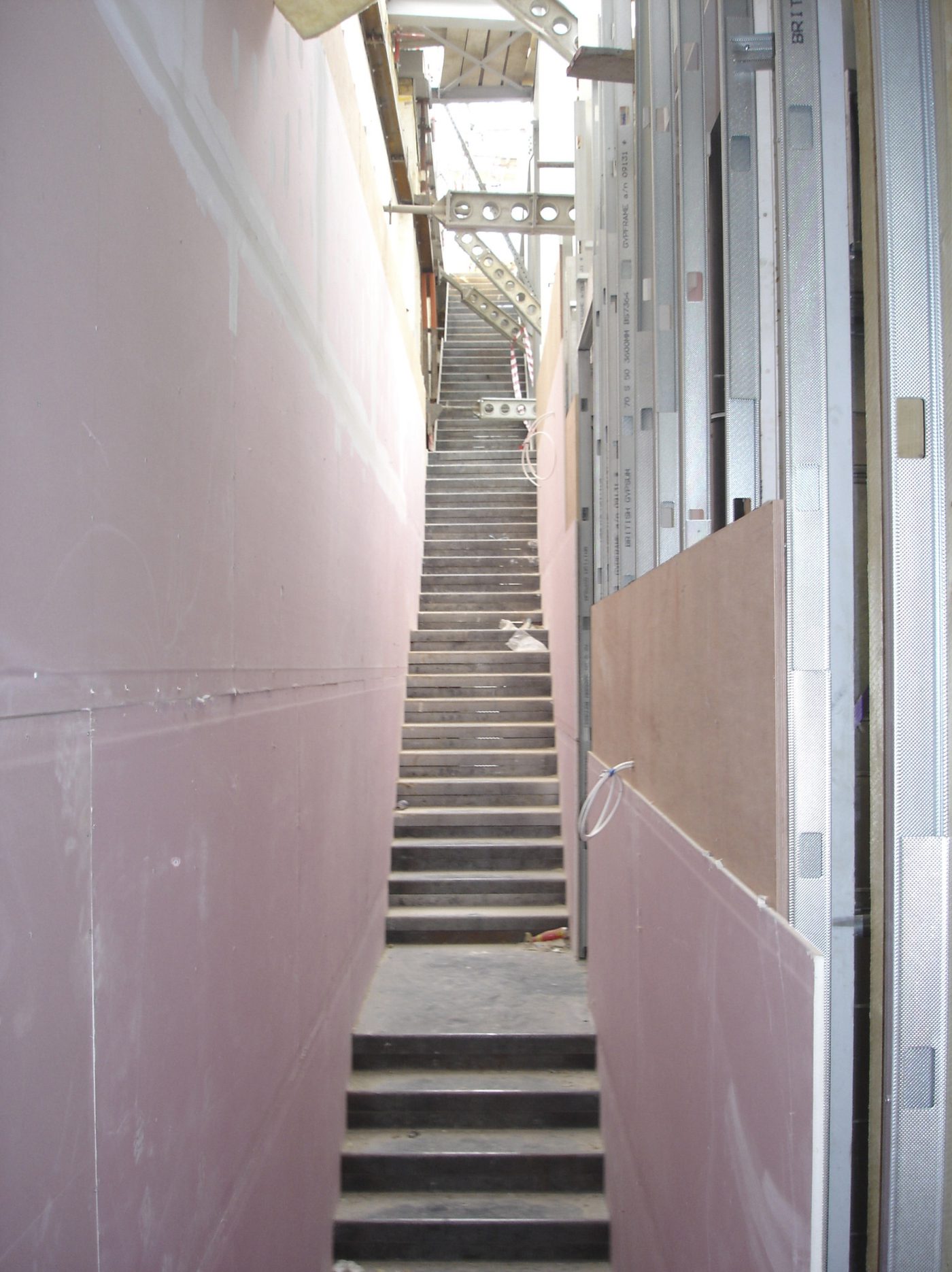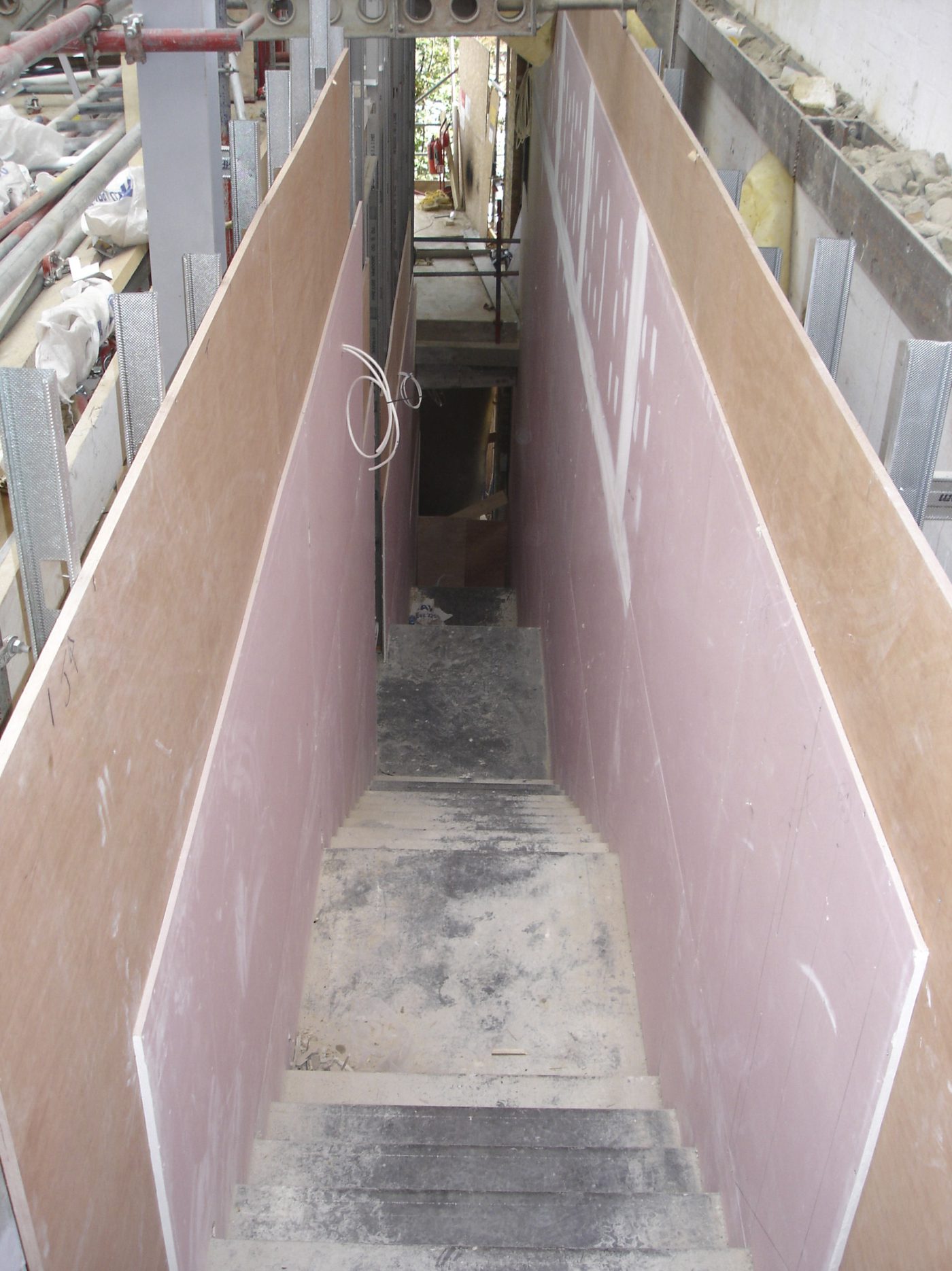 Much of the drama in this project involved the creation of slender staircases between vertiginous walls. However, the whole building needed to have its weight kept to a minimum and so the walls to each side of the staircases were built with a steel frame and then structural studwork. The cavities were filled with acoustic insulation to dampen the reverberation and the framework was then clad in marine ply followed by multiple layers of plasterboard. The primary staircase rises from ground floor to third floor in one long ascent, broken only by half landings and floor landings.