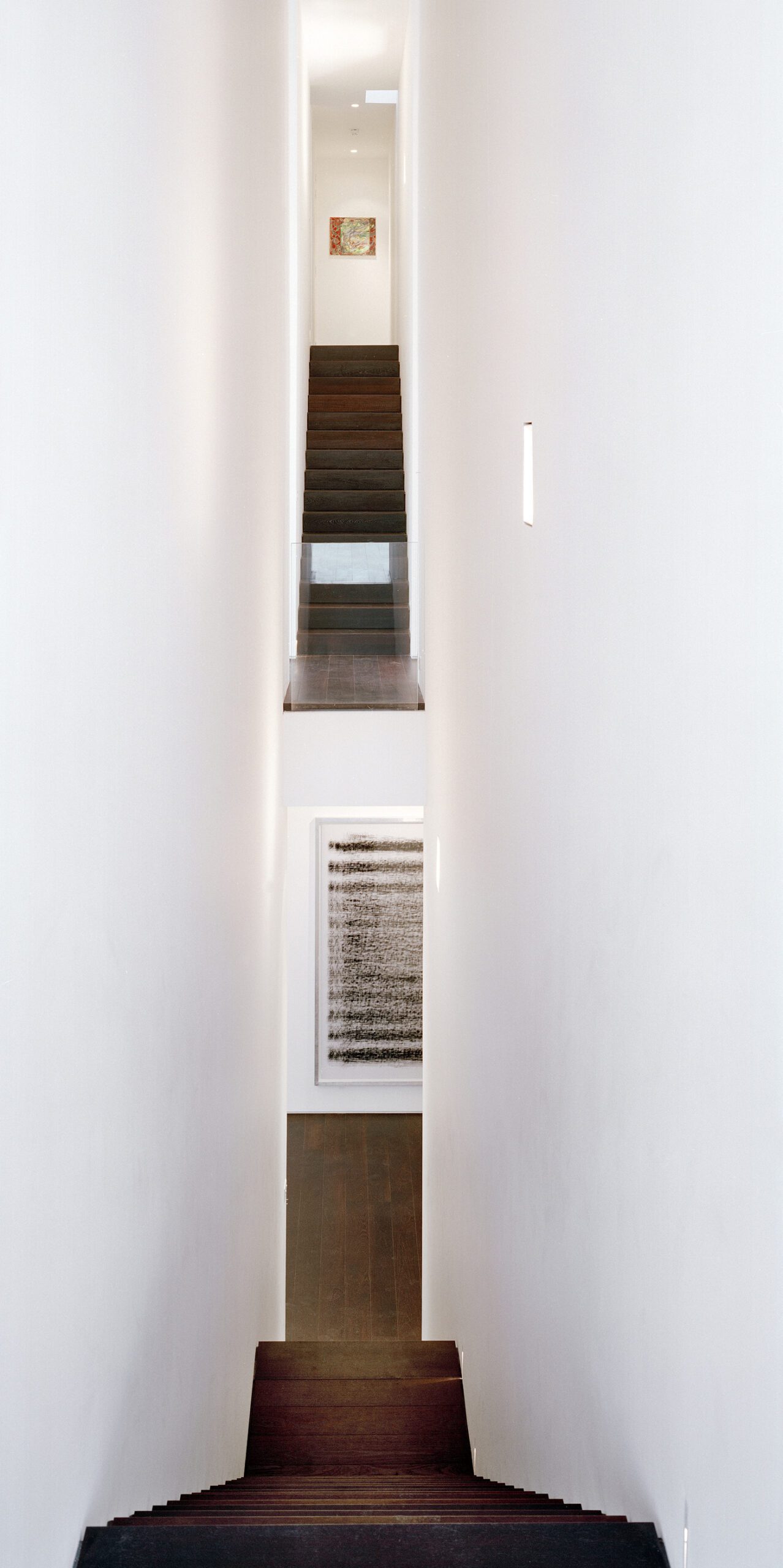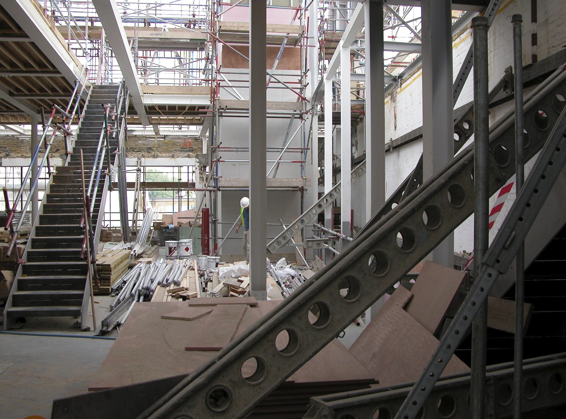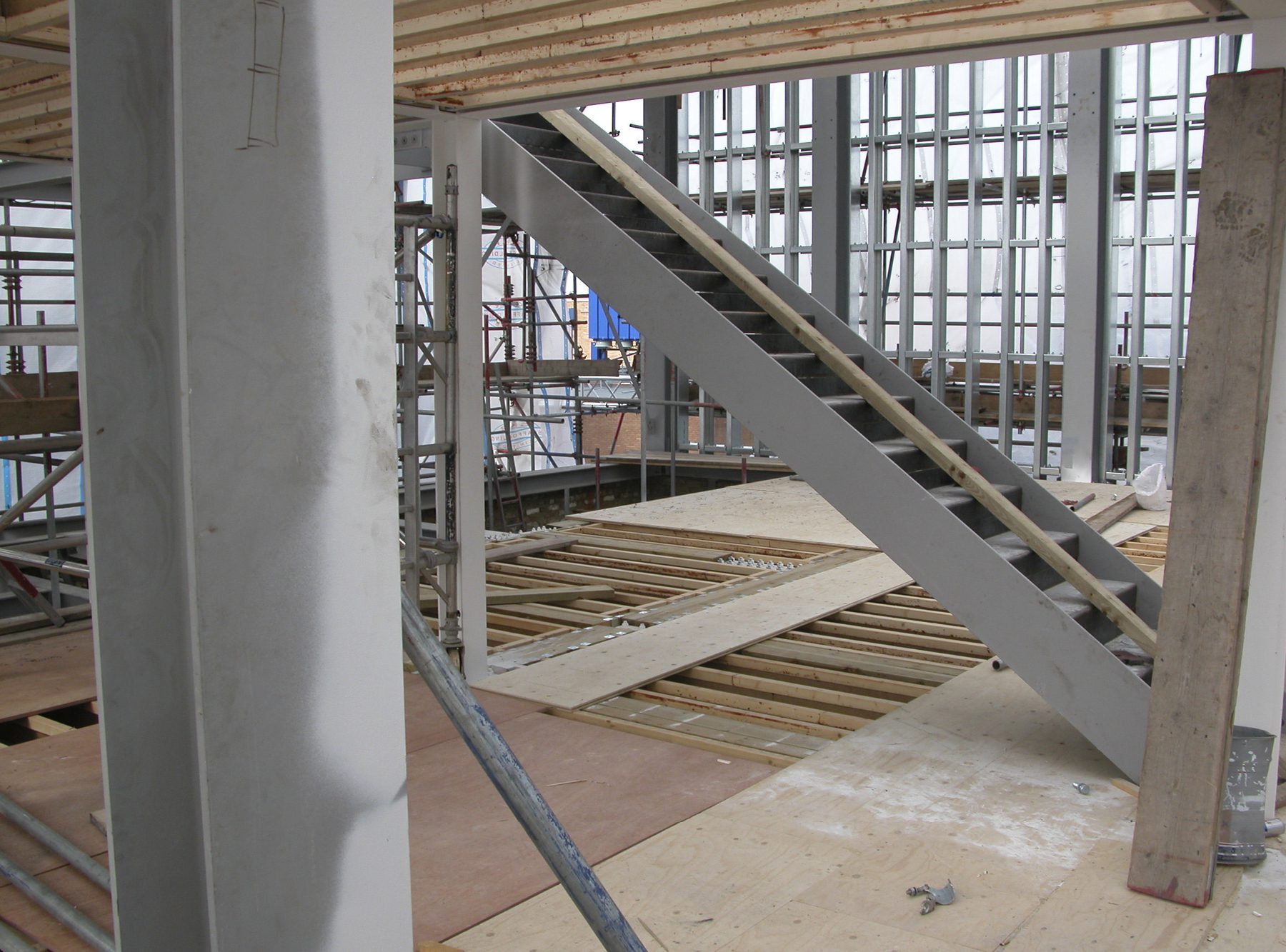 Much of the drama in this project involved the creation of slender staircases between vertiginous walls. However, the whole building needed to have its weight kept to a minimum and so the walls to each side of the staircases were built with a steel frame and then structural studwork. The cavities were filled with acoustic insulation to dampen the reverberation and the framework was then clad in marine ply followed by multiple layers of plasterboard. The primary staircase rises from ground floor to third floor in one long ascent, broken only by half landings and floor landings.