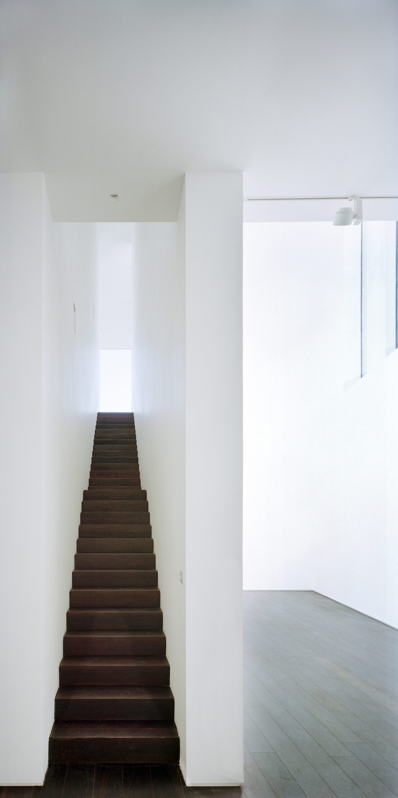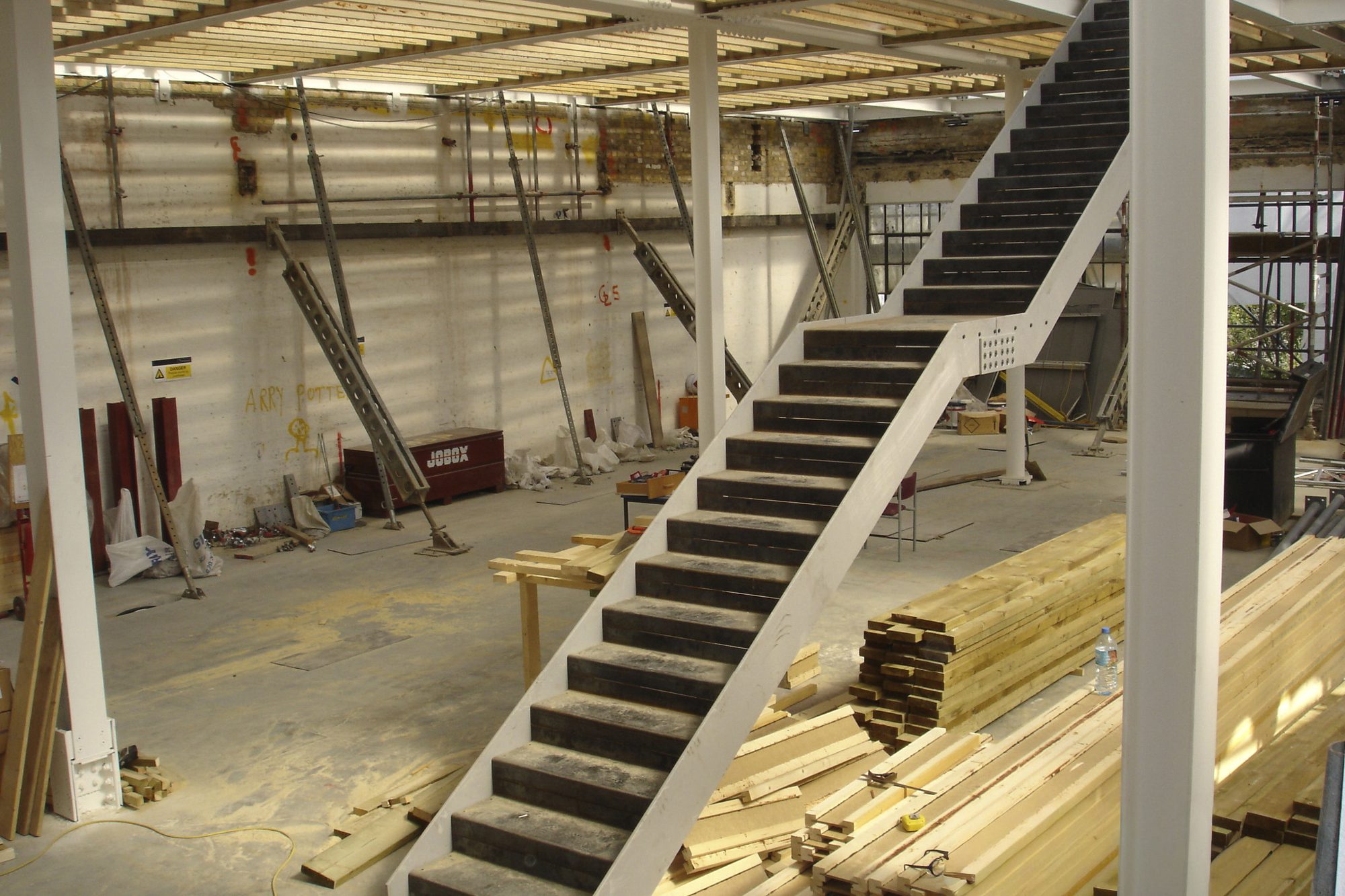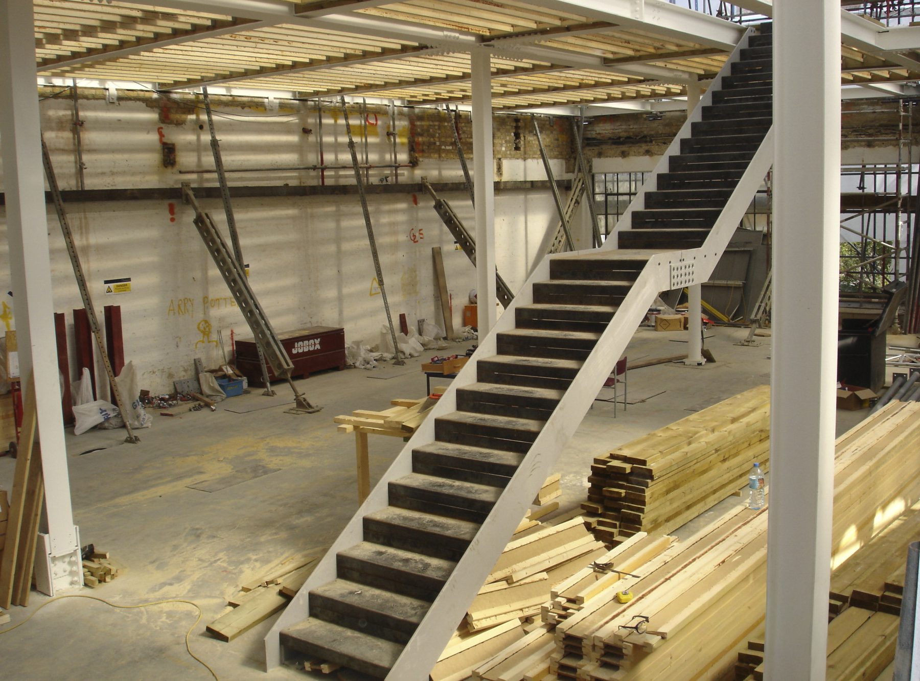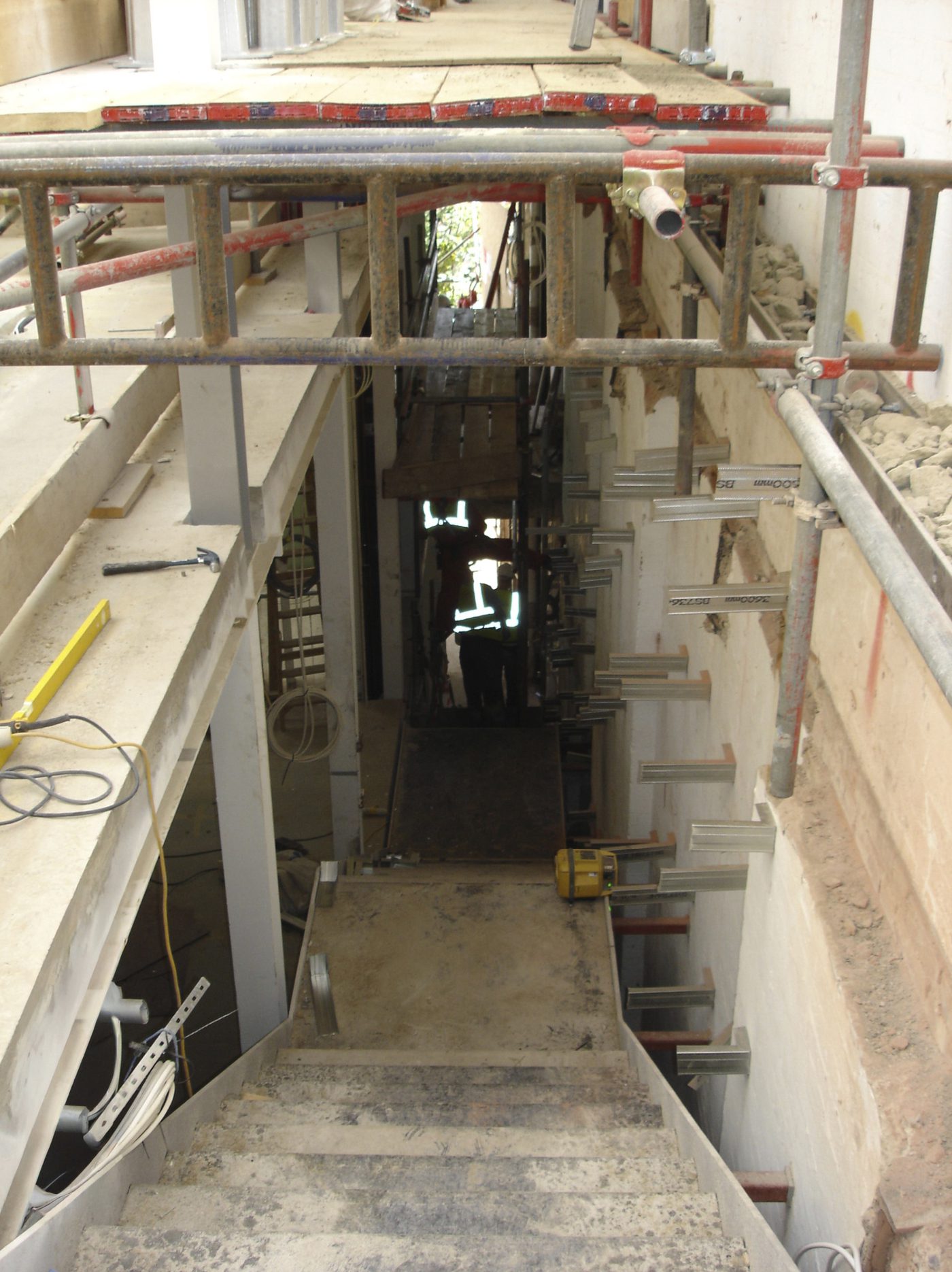 Much of the drama in this project involved the creation of slender staircases between vertiginous walls. However, the whole building needed to have its weight kept to a minimum and so the walls to each side of the staircases were built with a steel frame and then structural studwork. The cavities were filled with acoustic insulation to dampen the reverberation and the framework was then clad in marine ply followed by multiple layers of plasterboard. The primary staircase rises from ground floor to third floor in one long ascent, broken only by half landings and floor landings.
